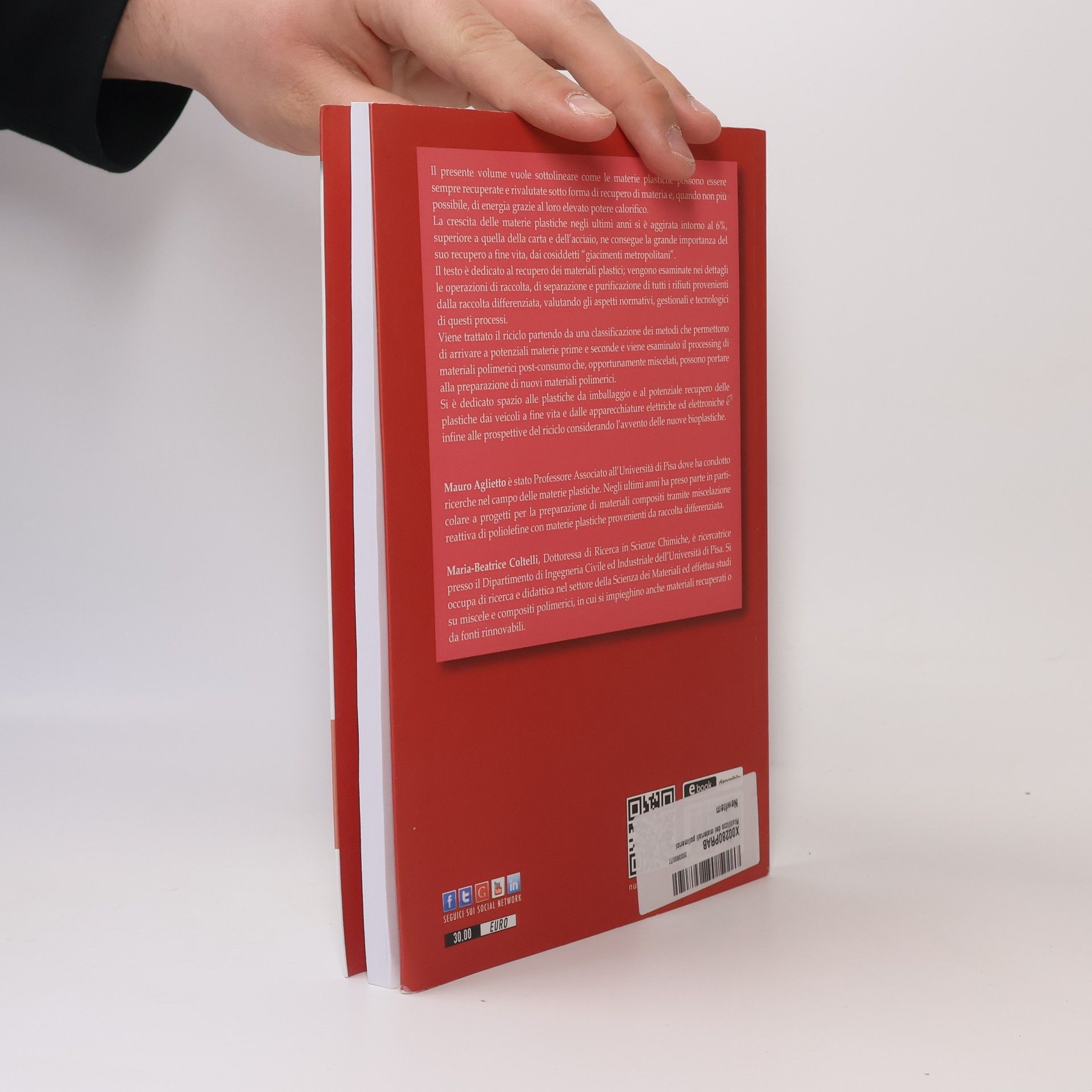 Il presente volume vuole sottolineare come le materie plastiche possono essere sempre recuperate e rivalutate sotto forma di recupero di materia e, quando non più possibile, di energia grazie al loro elevato potere calorifico.La crescita delle materie plastiche negli ultimi anni si è aggirata intorno al 6%, superiore a quella della carta e dell’acciaio, ne consegue la grande importanza del suo recupero a fine vita, dai cosiddetti “giacimenti metropolitani”. Il testo è dedicato al recupero dei materiali plastici; vengono esaminate nei dettagli le operazioni di raccolta, di separazione e purificazione di tutti i rifiuti provenienti dalla raccolta differenziata, valutando gli aspetti normativi, gestionali e tecnologici di questi processi. Viene trattato il riciclo partendo da una classificazione dei metodi che permettono di arrivare a potenziali materie prime e seconde e viene esaminato il processing di materiali polimerici post-consumo che, opportunamente miscelati, possono portare alla preparazione di nuovi materiali polimerici. Si è dedicato spazio alle plastiche da imballaggio e al potenziale recupero delle plastiche dai veicoli a fine vita e dalle apparecchiature elettriche ed elettroniche e infine alle prospettive del riciclo considerando l’avvento delle nuove bioplastiche.