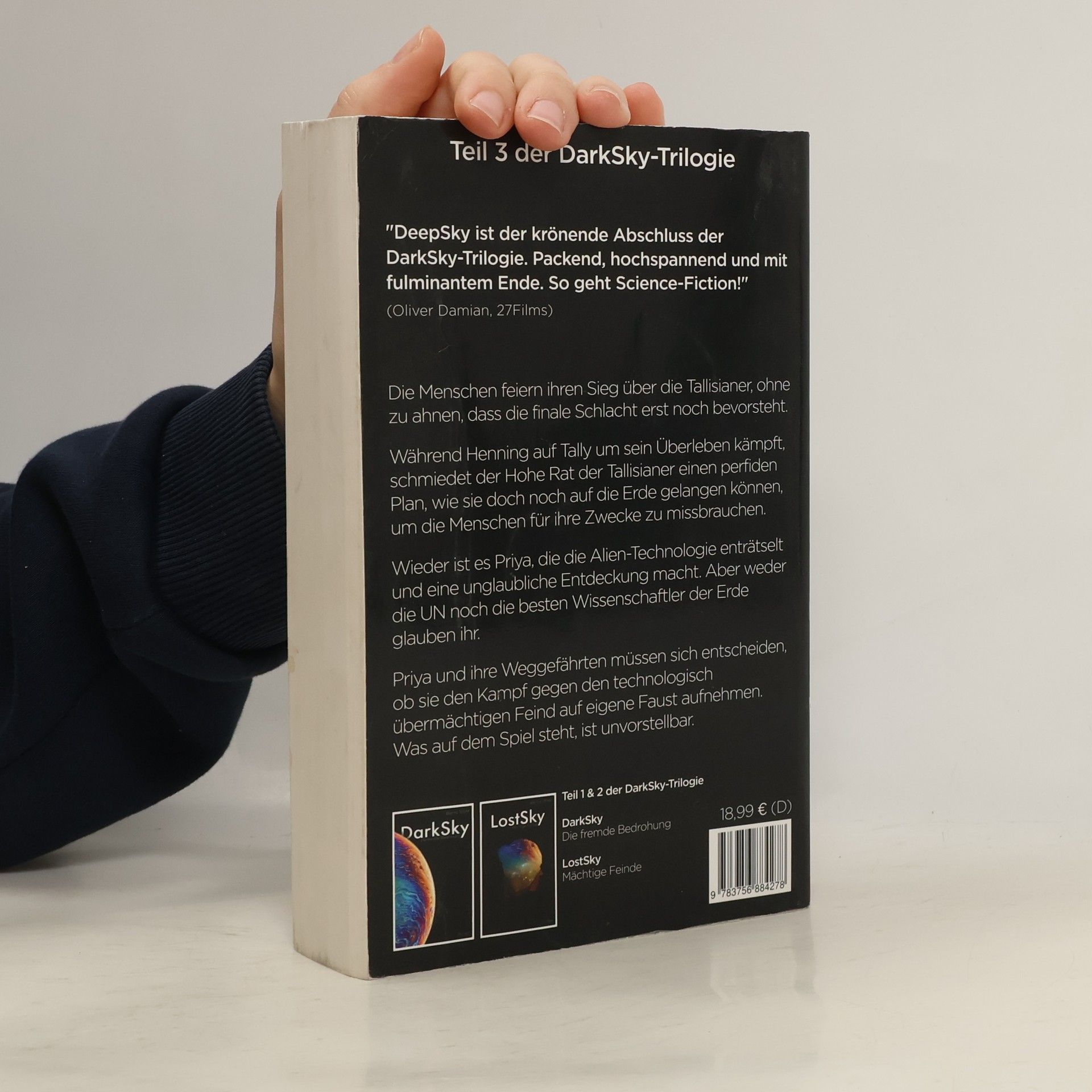 "DeepSky - Die letzte Entscheidung" ist der 3. Teil der DarkSky-Trilogie. Die Menschen feiern ihren Sieg über die Tallisianer, ohne zu ahnen, dass die finale Schlacht erst noch bevorsteht. Während Henning auf Tally um sein Überleben kämpft, schmiedet der Hohe Rat der Tallisianer einen perfiden Plan, wie sie doch noch auf die Erde gelangen können, um die Menschen für ihre Zwecke zu missbrauchen. Wieder ist es Priya, die die Alien-Technologie enträtselt und eine unglaubliche Entdeckung macht. Aber weder die UN noch die besten Wissenschaftler der Erde glauben ihr. Priya und ihre Weggefährten müssen sich entscheiden, ob sie den Kampf gegen den technologisch übermächtigen Feind auf eigene Faust aufnehmen. Was auf dem Spiel steht, ist unvorstellbar. Teil 1 und Teil 2 sind ebenfalls als Buch und E-Book verfügbar. 27Films aus Berlin hat die internationalen Filmrechte erworben und plant eine Umsetzung in eine Serie! Leserstimmen: "DeepSky ist der krönende Abschluss der DarkSky-Trilogie. Packend, hochspannend und mit fulminantem Ende. So geht Science-Fiction!" (Oliver Damian, 27Films)