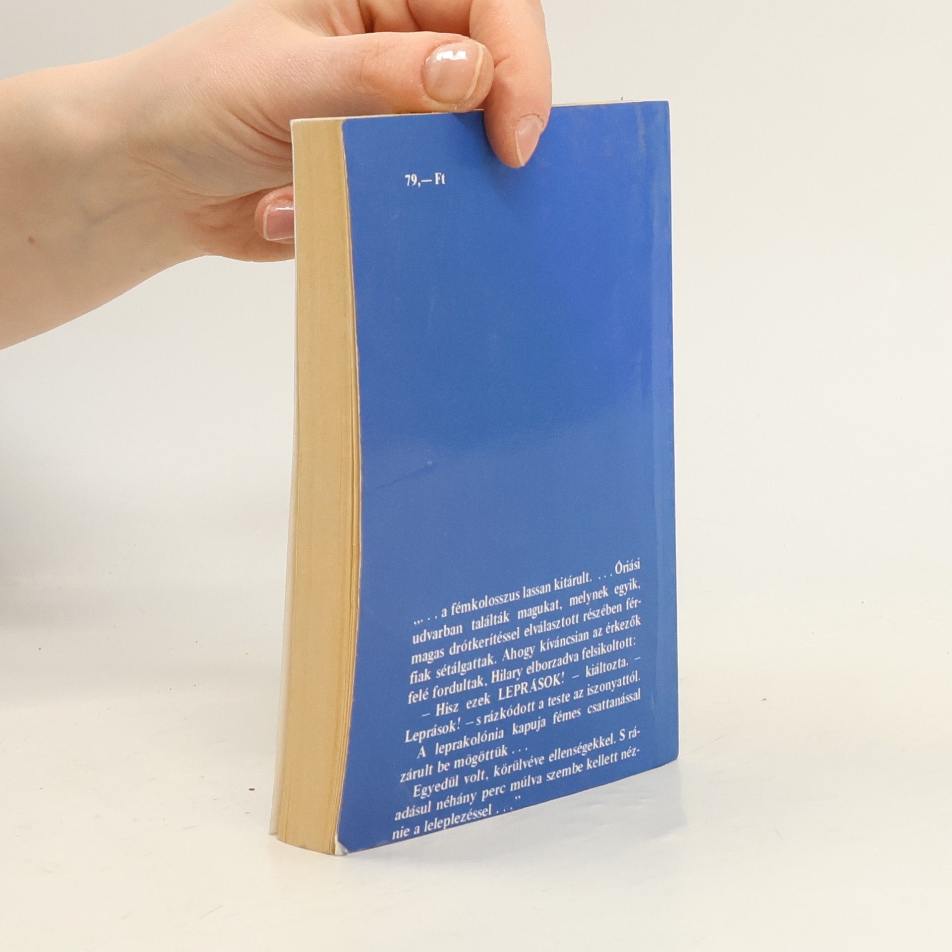 „… a fémkolosszus lassan kitárult… Óriási udvarban találták magukat, melynek egyik, magas drótkerítéssel elválasztott részében férfiak sétálgattak. Ahogy kíváncsian az érkezők felé fordultak, Hilary elborzadva felsikoltott: – Hisz ezek LEPRÁSOK! – kiáltozta. – Leprások! – s rázkódott a teste az iszonyattól. A leprakolónia kapuja fémes csattanással zárult be mögöttük… Egyedül volt, körülvéve ellenségekkel. S ráadásul néhány perc múlva szembe kellett néznie a leleplezéssel…”