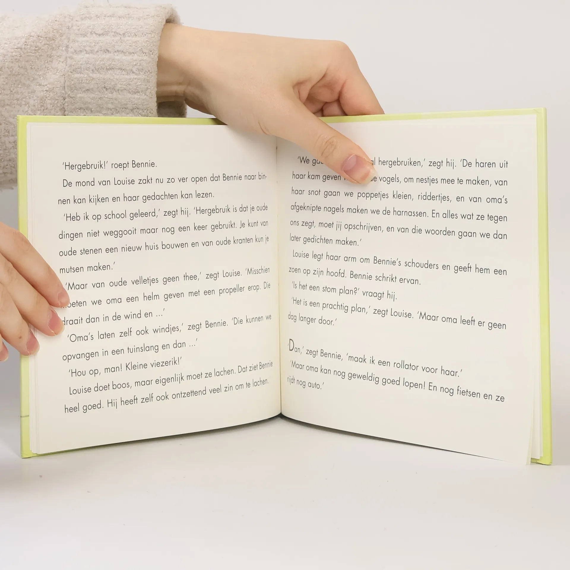 Louise probeert haar broertje Bennie uit te leggen wat duurzaamheid is. Bennie lijkt er weinig van te begrijpen, maar fantaseert erop los om hun oma duurzamer te maken. Voorlezen vanaf ca. 6 jaar.