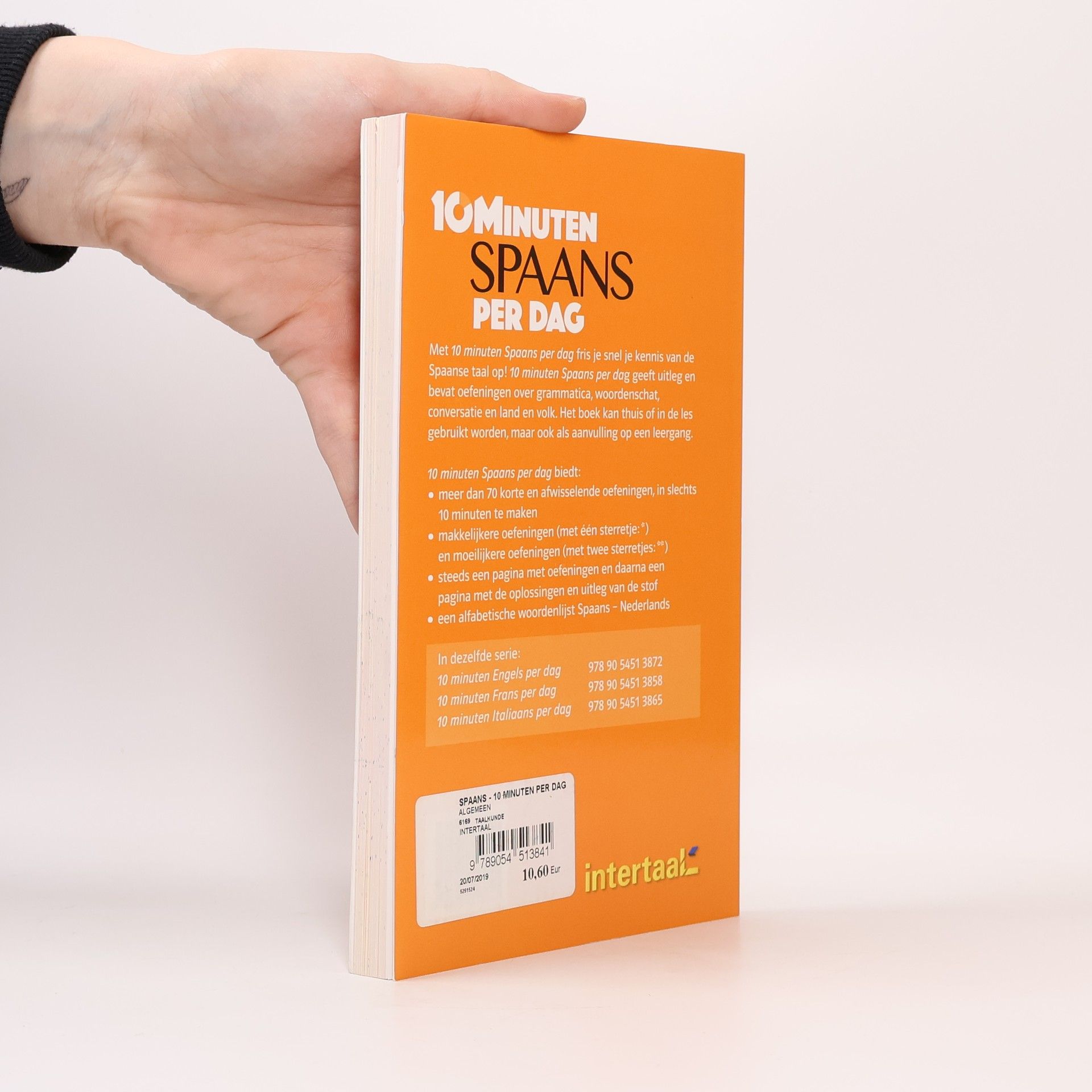 Met 10 minuten Spaans per dag fris je snel je kennis van de Spaanse taal op! 10 minuten Spaans per dag geeft uitleg en bevat oefeningen over grammatica, woordenschat, conversatie en land en volk. Het boek kan thuis of in de les gebruikt worden, maar ook als aanvullign op een leergang.10 minuten Spaans per dag biedt:- meer dan 70 korten en afwisselende oefeningen, in slechts 10 minuten te maken- makkelijkere oefeningen (met één sterretje *) en moeilijkere oefeningen (met twee sterretjes **)- steeds een pagina met oefeningen en daarna een pagina met de oplossingen en uitleg van de stof- een alfabetische woordenlijst Spaans-NederlandsIn dezelfde serie:10 minuten Engels per dag10 minuten Frans per dag10 minuten Italiaans per dag