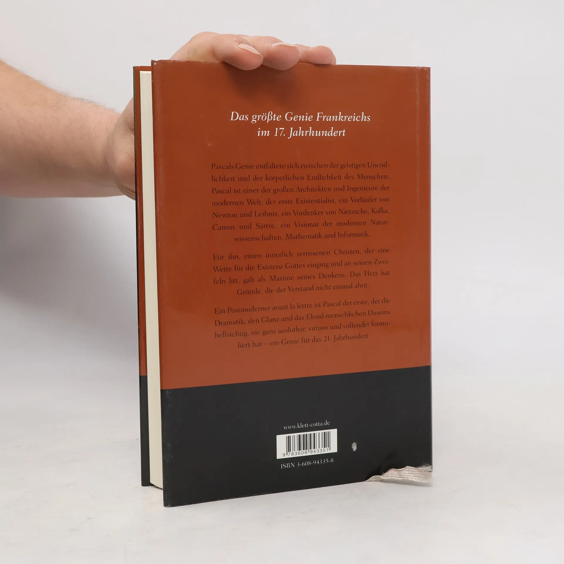 Blaise Pascal (1623-1662) war ein Wunderkind und das größte Genie Frankreichs: ein rastloser, nervöser Querdenker, ein zweifelnder und verzweifelnder Christ. Seine Erkenntnisse in Mathematik und Philosophie waren bahnbrechend, und unsterblich sind seine Gedanken über Würde und Elend des menschlichen Daseins. Sein Biograph entwirft mit Leidenschaft das große Drama dieses universellen Geistes. Ohne fremde Hilfe leitete das 13jährige Wunderkind Blaise Pascal (1623 - 1662) die Grundlagen der Geometrie und Mathematik ab, entwarf als junger Mann die der Wahrscheinlichkeitsrechnung und Statistik. Die Binomischen Formeln gehen auf ihn zurück, eine Abhandlung über Kegelschnitte verfaßte er mit 16 Jahren, skizzierte die erste Rechenmaschine mit 19 Jahren und formulierte mathematische Einsichten für die Infinitesimalrechnung, ohne die moderne Techniken undenkbar wären - eine rastlose, nervöse Existenz. Vorläufer von Newton und Leibniz, Vordenker von Nietzsche, Kafka, Camus und Sartre ist er ein innerlich zerrissener Christ, der eine Wette für die Existenz Gottes einging und doch an seinen Zweifeln litt: Pascal ist der erste, der die Dramatik, den Glanz und das Elend menschlichen Daseins hellsichtig, virtuos und vollendet formuliert hat - ein Genie für das 21. Jahrhundert.