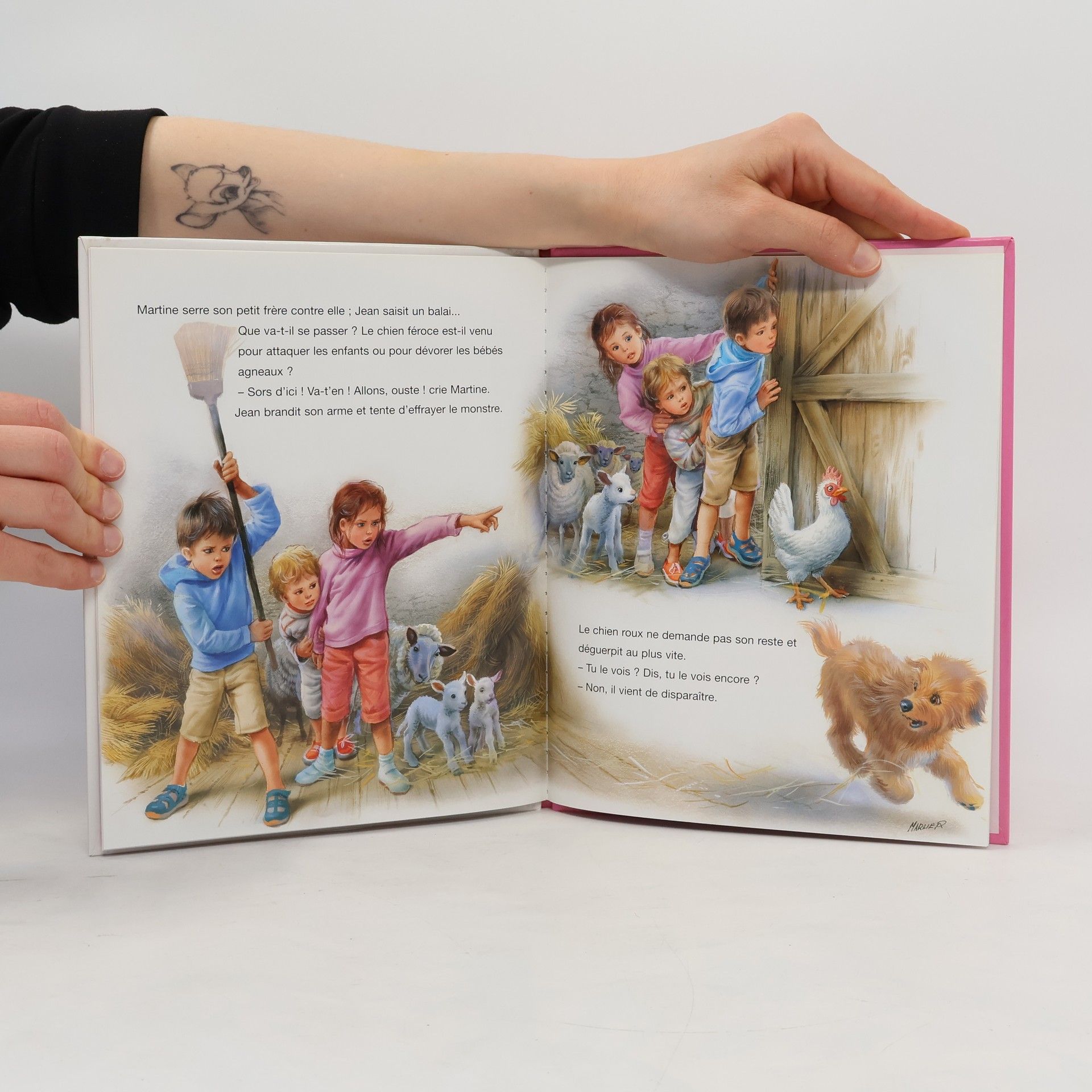 En jouant avec le cerf-volant de tante Lucie, Martine, Jean et le petit Alain se font surprendre par un violent orage. Pour se mettre à l’abri, ils se précipitent sous un arbre à la taille imposante, mais un gros chien survient d’on ne sait où. Il aboie très fort et semble bien peu commode. Apeurés, les enfants abandonnent leur « arbre refuge » et se rendent à la ferme voisine.La fermière les accueille et prévient aussitôt tante Lucie, qui les cherche partout... Elle leur fait visiter les étables, histoire de patienter et de les rassurer. Mais voilà que réapparaît le chien de tout à l’heure. Persuadé d’être poursuivi par un bête malfaisante, Jean se saisit d’un balai et le chasse. Arrête, lui dit la fermière. C’est Roucky, notre chien. Il ne vous fera rien. À peine a-t-elle dit cela que tante Lucie arrive, toute inquiète. L’arbre sous lequel les enfants voulaient se réfugier est tombé, foudroyé. Le chien l’avait-il pressentit ? Sans doute, dit la fermière. Ces animaux connaissent la nature mieux que nous. Leur instinct les guide et même s’ils ne parlent pas, ils ont beaucoup à nous apprendre.