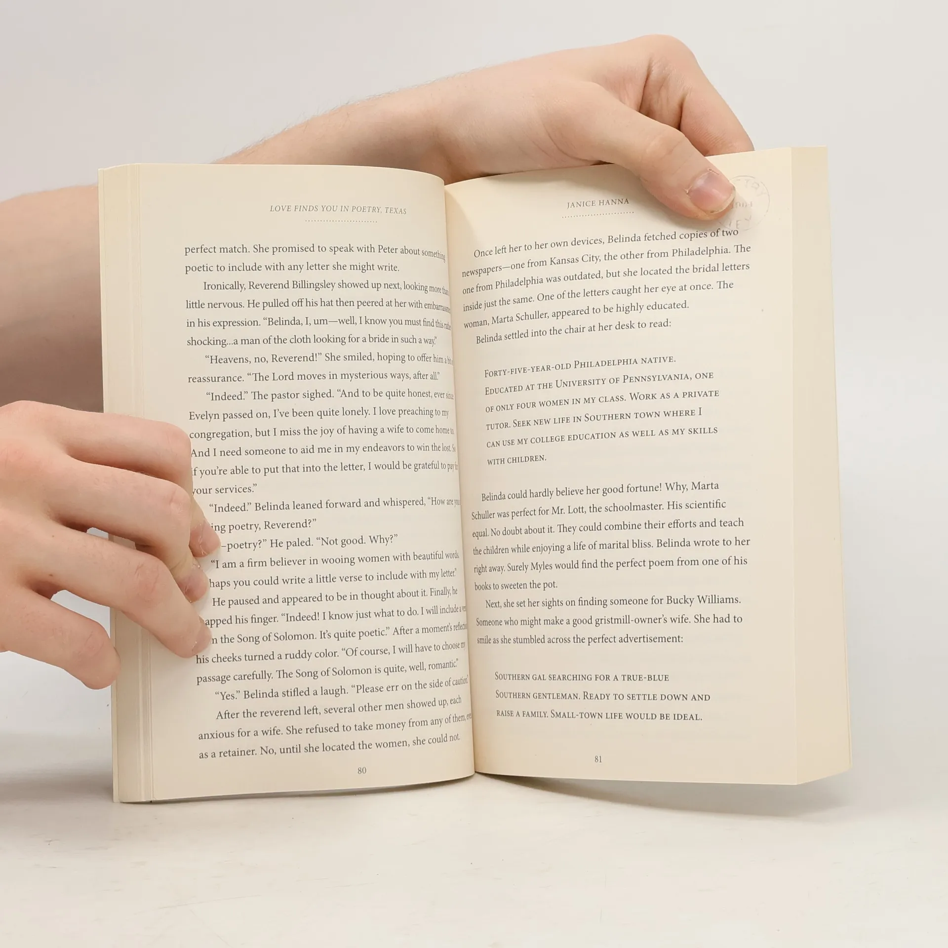 In the German community of Poetry, Texas, Belinda Bauer spies an opportunity. The tiny town is filled with loggers and railroad men in need of wives, so she sets herself up as a marriage broker. She writes little poems to be printed in newspapers all over the country, and, one by one, women begin to arrive in Poetry. There's only one problem: Belinda doesn't have a clue what she's doing and all the brides marry the wrong men! One client is particularly unhappy. Georg Kaufman, the local barber, has lost more than one prospective wife to Belinda's fumbled attempts. For some reason, she just can't seem to find Georg's perfect match, though it's not for lack of trying. Is there a poetic ending in store for Georg and for Belinda herself?