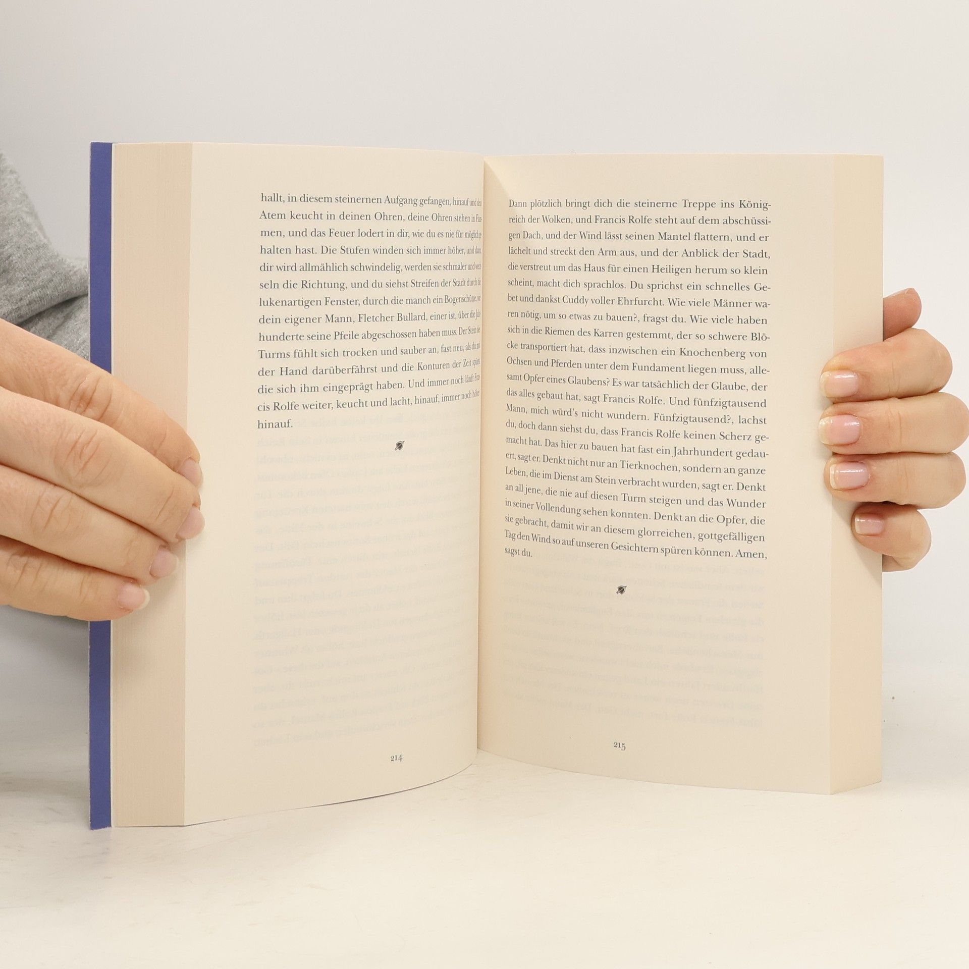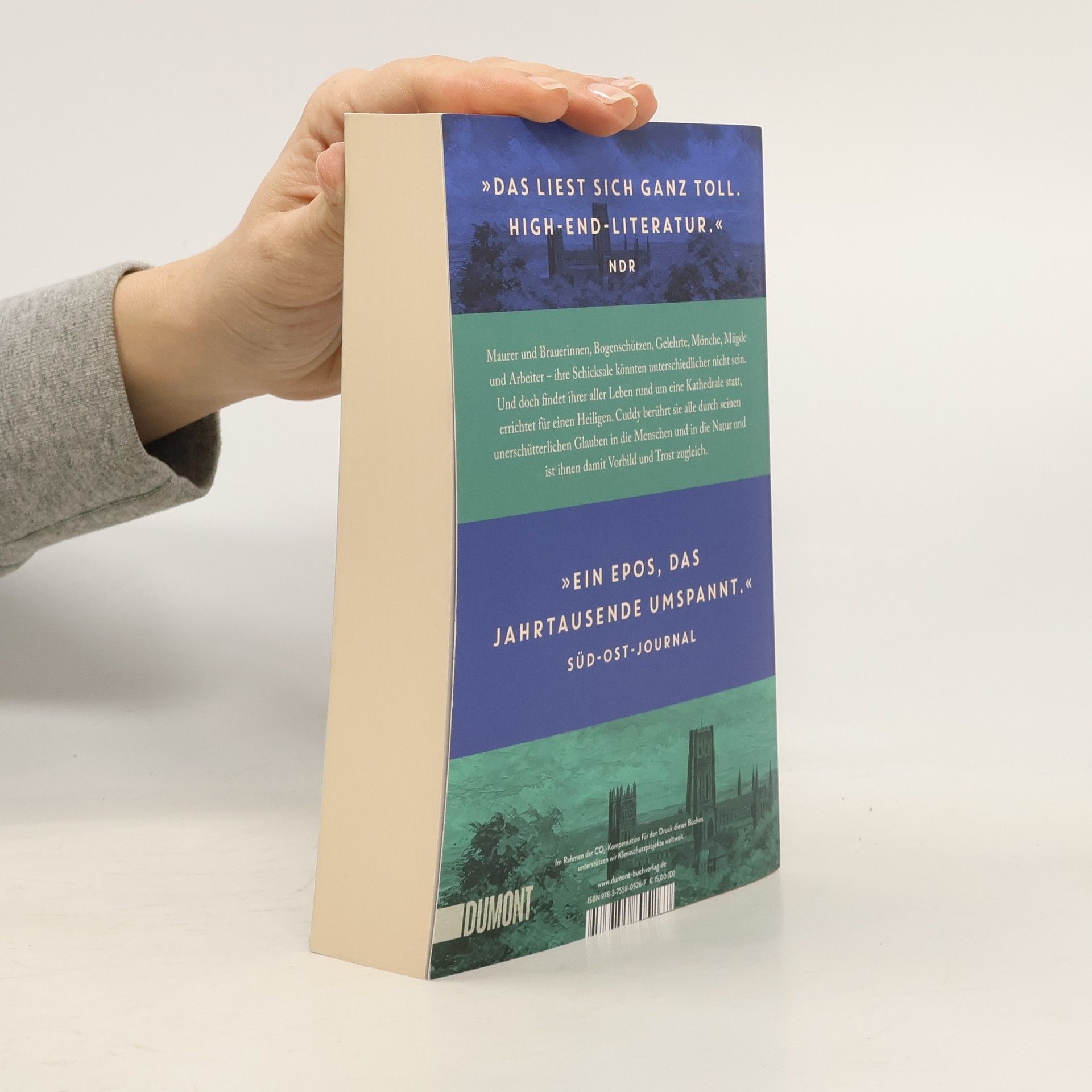 Eine junge Frau, unterwegs in einer bedrohlichen Gegend, hat plötzlich das Bild einer Kathedrale auf einem Hügel vor ihrem inneren Auge. Sie wünscht sich nichts sehnlicher als den Schutz des heiligen Cuthberts, für dessen Gebeine sie und ihre Begleiter eine letzte Ruhestätte suchen. Die unterdrückte Ehefrau eines Bogenschützens hofft, die Wahrheit zwischen imposanten Kirchenmauern zu finden. Als sie erneut Quälereien durch ihren Ehemann ausgesetzt ist, sucht sie Hilfe bei einem der feinsinnigen Steinmetze. Ein Professor, der bei der Exhumierung von Cuthbert zugegen ist, erhält in den Nächten unwillkommenen, angsteinflößenden Besuch. Ein junger Hilfsarbeiter trifft bei der Arbeit in der Kathedrale nicht nur auf freundliche Menschen, sondern erlebt Momente der Hoffnung auf eine bessere Zukunft. ›Cuddy – Echo der Zeit‹ verbindet Poesie und Prosa, verschiedene Textarten und reale historische Begebenheiten und spannt dabei einen Bogen über die Epochen zu einem außergewöhnlichen Roman.