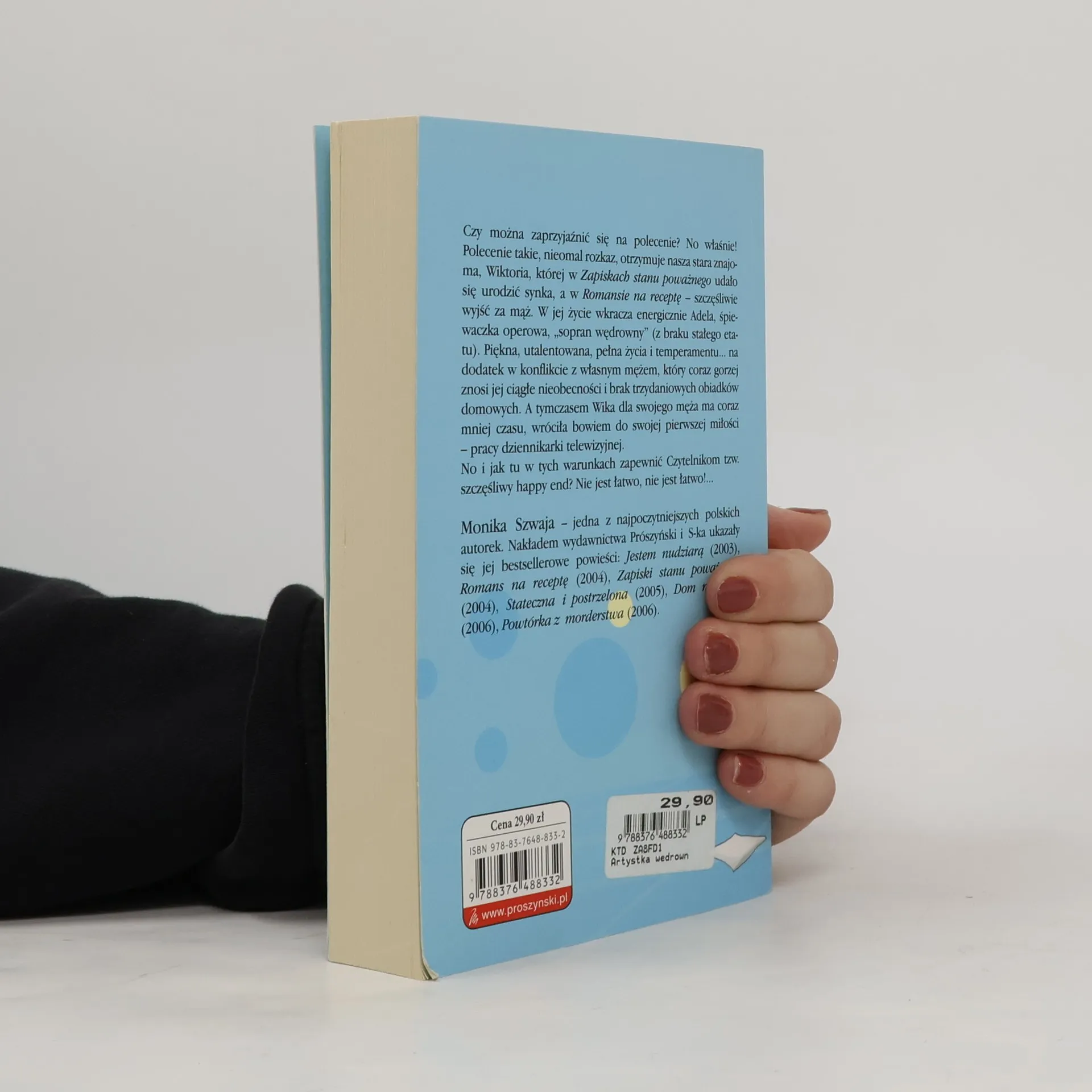 Czy można zaprzyjaźnić się na polecenie? No właśnie! Polecenie takie, nieomal rozkaz, otrzymuje nasza stara znajoma, Wiktoria, której w "Zapiskach stanu poważnego" udało się urodzić synka, a w "Romansie na receptę" - szczęśliwie wyjść za mąż. W jej życie wkracza energicznie Adela, śpiewaczka operowa, "sopran wędrowny" (z braku stałego etatu). Piękna, utalentowana, pełna życia i temperamentu... na dodatek w konflikcie z własnym mężem, który coraz gorzej znosi jej ciągłe nieobecności i brak trzydaniowych obiadków domowych. A tymczasem Wika dla swojego męża ma coraz mniej czasu, wróciła bowiem do swojej pierwszej miłości - pracy dziennikarki telewizyjnej. No i jak tu w tych warunkach zapewnić Czytelnikom tzw. szczęśliwy happy end? Nie jest łatwo, nie jest łatwo!