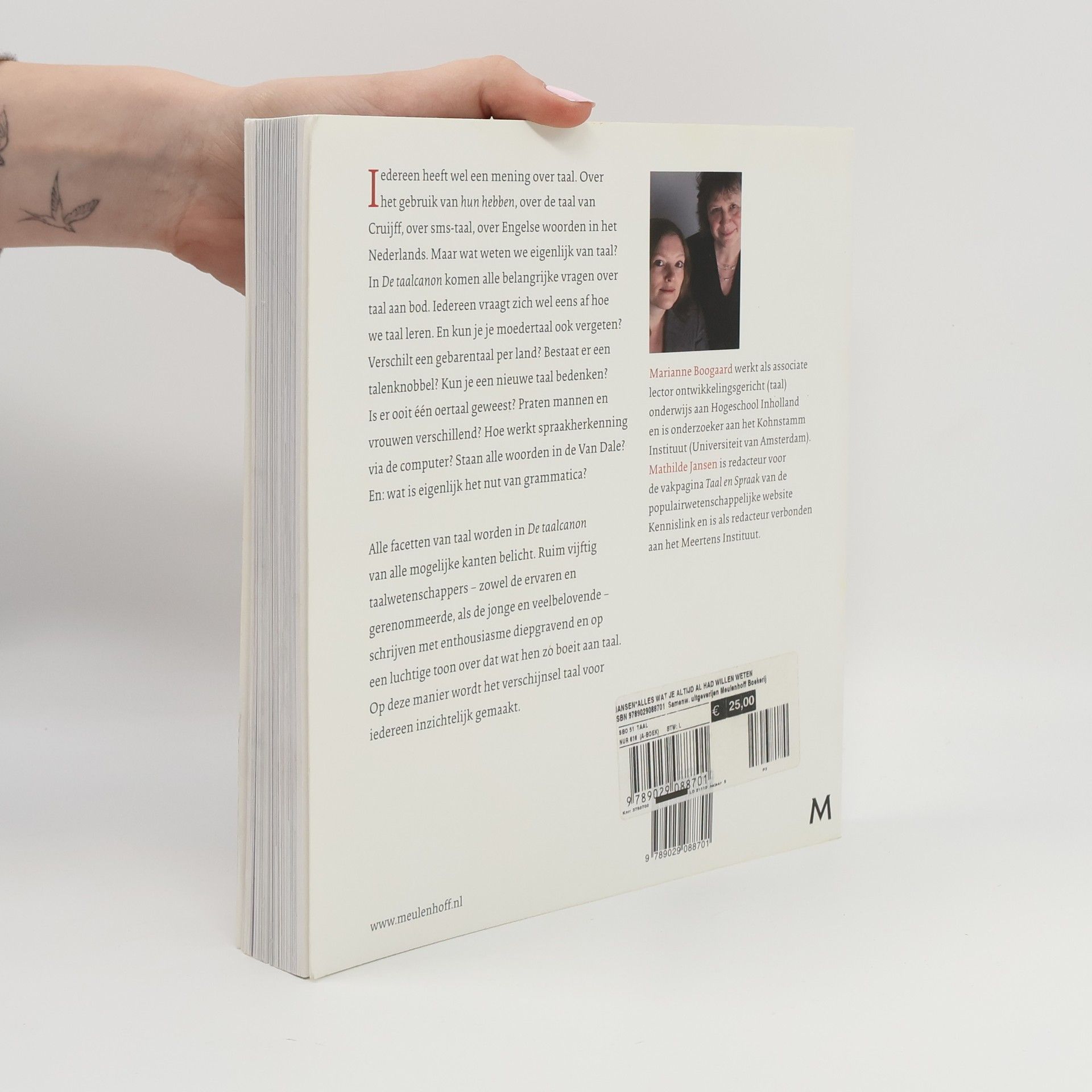 Iedereen heeft wel een mening over taal. Over het gebruik van hun hebben, over de taal van Cruijff, over sms-taal, over Engelse woorden in het Nederlands. Maar wat weten we eigenlijk van taal? In De taalcanon komen alle belangrijke vragen over taal aan bod. Iedereen vraagt zich wel eens af hoe we taal leren. En kun je je moedertaal ook vergeten? Verschilt een gebarentaal per land? Bestaat er een talenknobbel? Kun je een nieuwe taal bedenken? Is er ooit één oertaal geweest? Praten mannen en vrouwen verschillend? Hoe werkt spraakherkenning via de computer? Staan alle woorden in de Van Dale? En: wat is eigenlijk het nut van grammatica? In De taalcanon schrijven vijftig taalwetenschappers met enthousiasme, diepgravend en op een luchtige toon over dat wat hen zo boeit aan het verschijnsel 'taal'. Op deze manier wordt het verschijnsel taal voor iedereen inzichtelijk gemaakt.