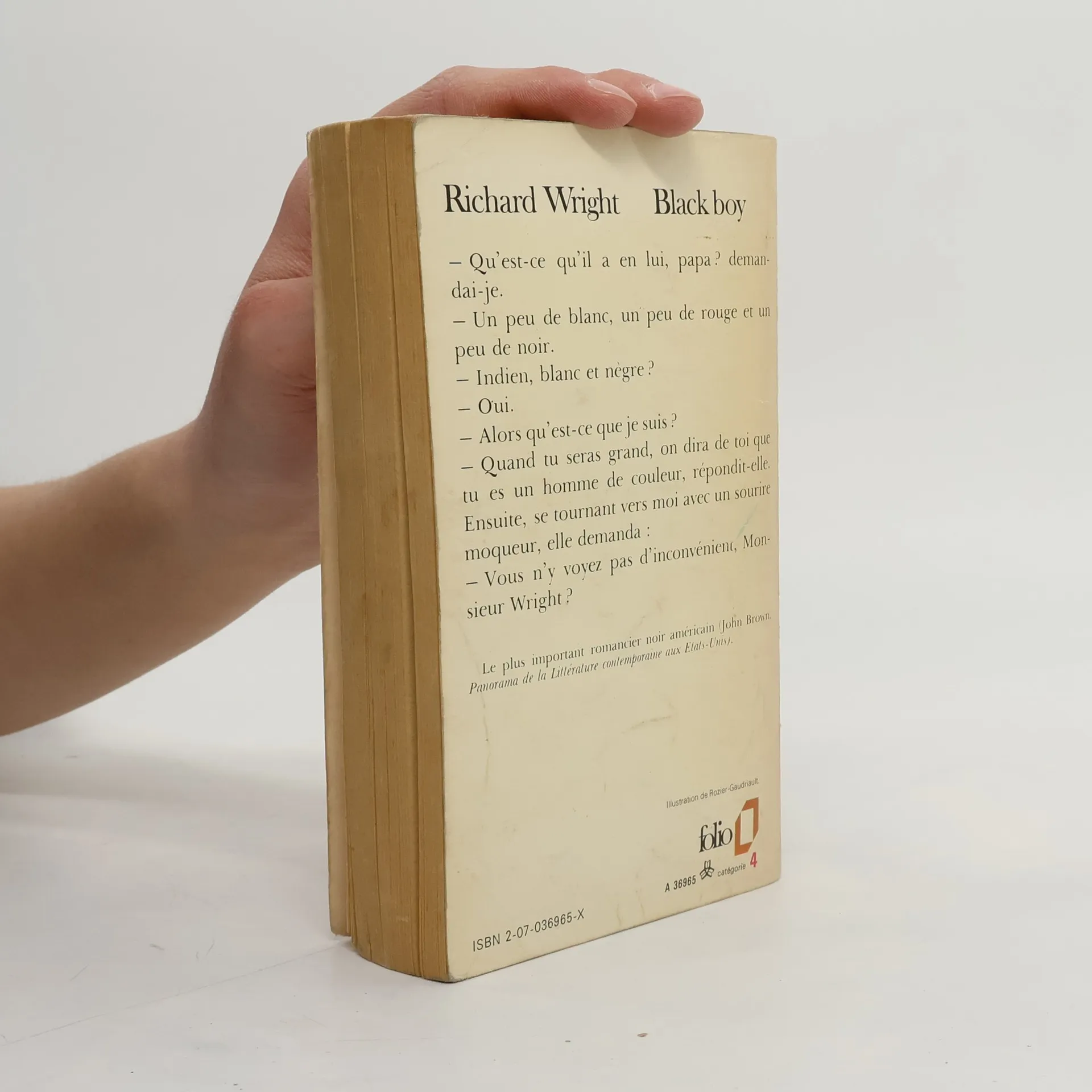 «- Qu'est-ce qu'il a en lui, papa ? demandai-je. - Un peu de blanc, un peu de rouge et un peu de noir. - Indien, blanc et nègre ? - Oui. - Alors qu'est-ce que je suis ? - Quand tu seras grand, on dira de toi que tu es un homme de couleur, répondit-elle. Ensuite, se tournant vers moi avec un sourire moqueur, elle demanda : - Vous n'y voyez pas d'inconvénient, Monsieur Wright ?»