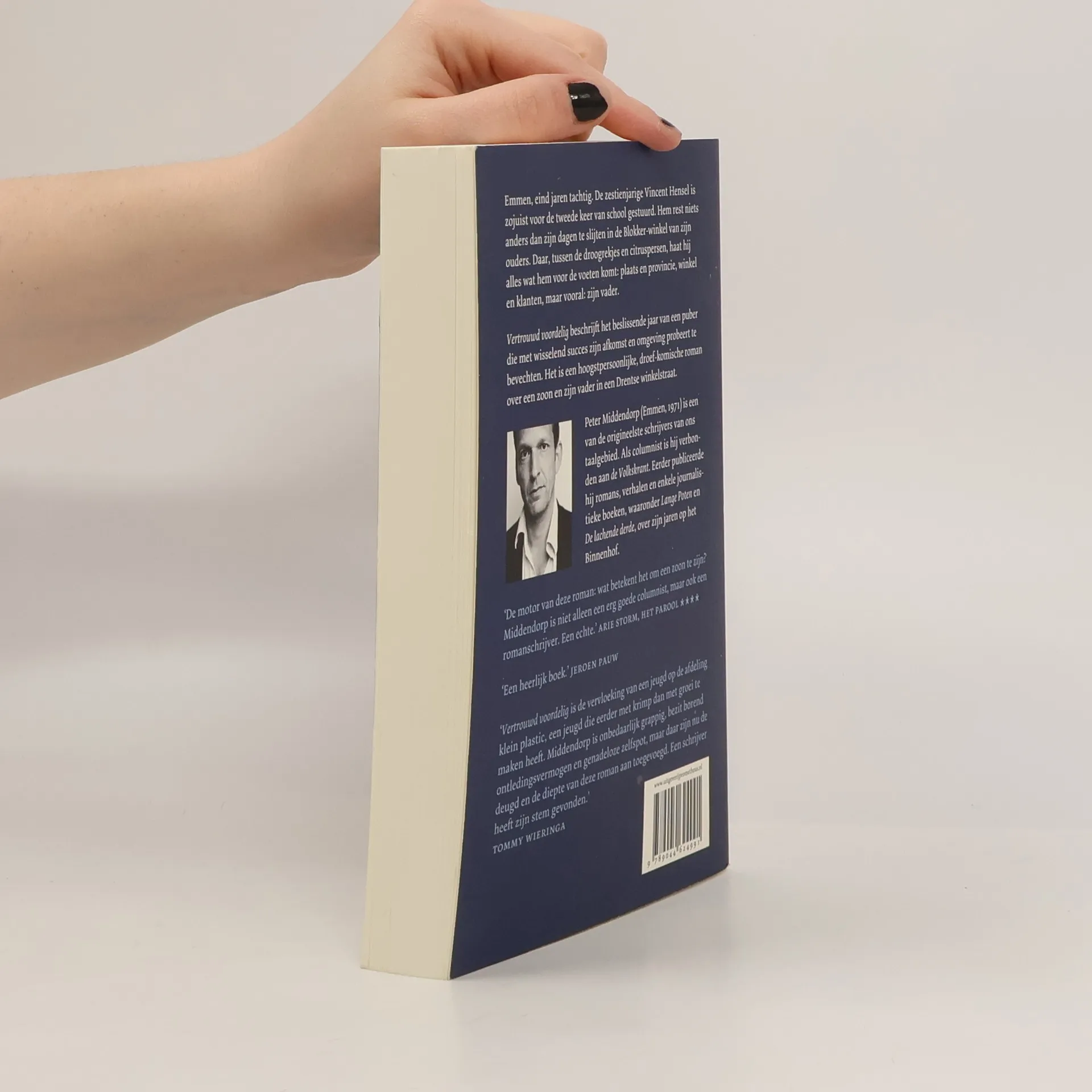 Emmen, eind jaren tachtig. De zestienjarige Vincent Hensel is zojuist voor de tweede keer van school gestuurd. Hem rest niets anders dan zijn dagen te slijten in de Blokker-winkel van zijn ouders. Daar, tussen de droogrekjes en citruspersen, haat hij alles wat hem voor de voeten komt: plaats en provincie, winkel en klanten, maar vooral: zijn vader. Vertrouwd voordelig beschrijft het beslissende jaar van een puber die met wisselend succes zijn afkomst en omgeving probeert te bevechten. Het is een hoogstpersoonlijke, droef-komische roman over een zoon en zijn vader in een Drentse winkelstraat. Peter Middendorp (Emmen, 1971) is een van de origineelste schrijvers van ons taalgebied. Als columnist is hij verbonden aan de Volkskrant. Eerder publiceerde hij romans, verhalen en enkele journalistieke boeken, waaronder Lange Poten en De lachende derde, over zijn jaren op het Binnenhof. '