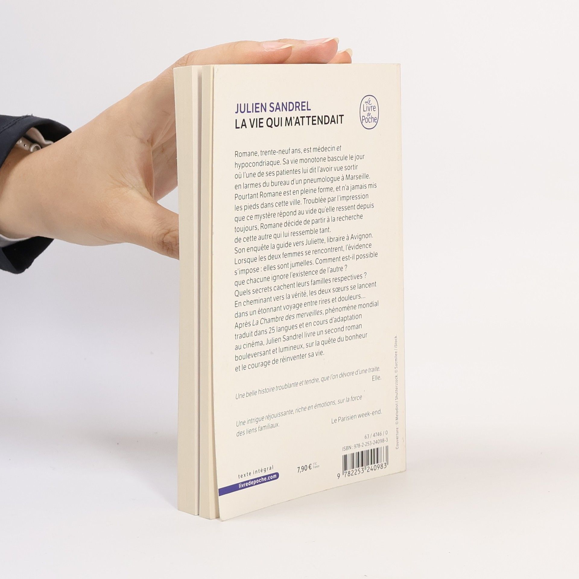 Romane, trente-neuf ans, est médecin ET hypocondriaque. Sa vie monotone bascule le jour où l’une de ses patientes lui dit l’avoir vue sortir en larmes du bureau d’un pneumologue à Marseille. Pourtant Romane est en pleine forme, et n’a jamais mis les pieds dans cette ville. Troublée par l’impression que ce mystère répond au vide qu’elle ressent depuis toujours, Romane décide de partir à la recherche de cette autre qui lui ressemble tant. Son enquête la guide vers Juliette, libraire à Avignon. Lorsque les deux femmes se rencontrent, l’évidence s’impose : elles sont jumelles. Comment est-il possible que chacune ignore l’existence de l’autre ? Quels secrets cachent leurs familles respectives ? En cheminant vers la vérité, les deux sœurs se lancent dans un étonnant voyage entre rires et douleurs… Après La Chambre des merveilles, phénomène mondial traduit dans 26 langues et en cours d’adaptation au cinéma, Julien Sandrel livre un second roman bouleversant et lumineux, sur la quête du bonheur et le courage de réinventer sa vie.