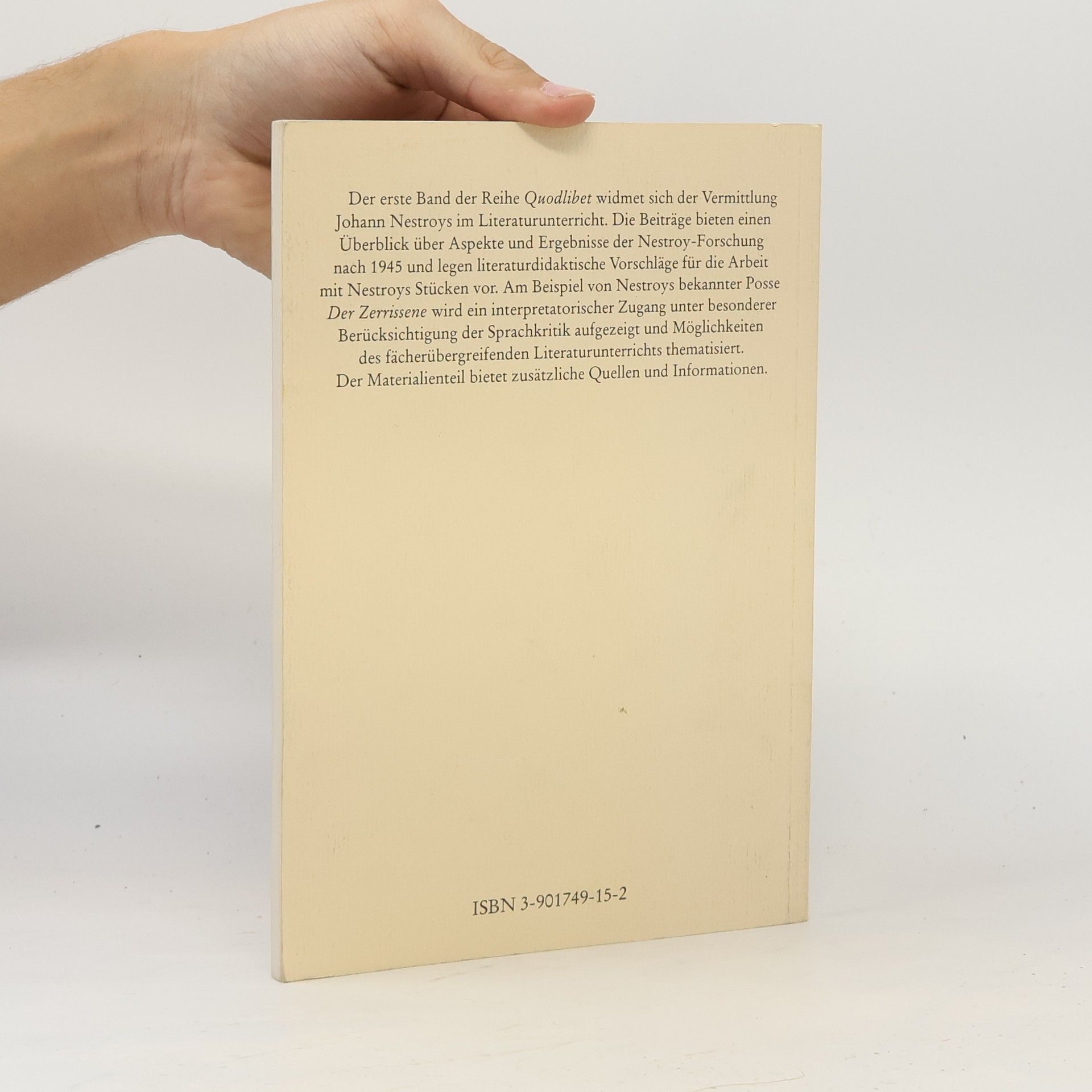 Der erste Band der Reihe Quodlibet widmet sich der Vermittlung Johann Nestroys im Literaturunterricht. Die Beiträge bieten einen Überblick über Aspekte und Ergebnisse der Nestroy-Forschung nach 1945 und legen literaturdidaktische Vorschläge für die Arbeit mit Nestroys Stücken vor. Am Beispiel von Nestroys bekannter Posse „Der Zerrissene“ wird ein interpretatorischer Zugang unter besonderer Berücksichtigung der Sprachkritik aufgezeigt und Möglichkeiten des fächerübergreifenden Literaturunterrichts thematisiert. Der Materialienteil bietet zusätzliche Quellen und Informationen.