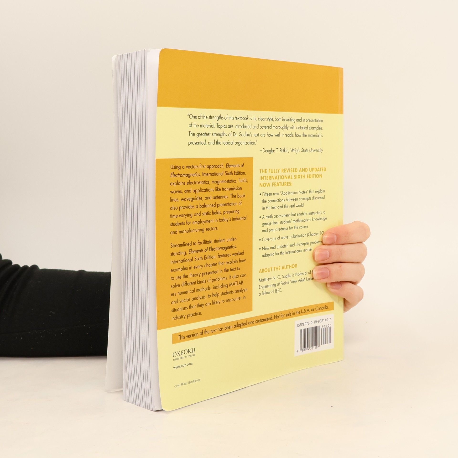 Elements of Electromagnetics, Fifth Edition, uses a vectors-first approach to explain electrostatics, magnetostatics, fields, waves, and applications like transmission lines, waveguides, and antennas. The book also provides a balanced presentation of time-varying and static fields, preparing students for employment in today's industrial and manufacturing sectors. The new edition includes new Application Notes detailing real-world connections, coverage of wave polarization states, a math pre-test for professors to assess students' mathematical skills, and new and updated problems.