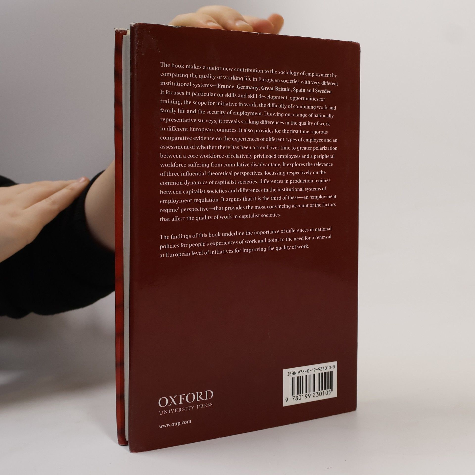 The book makes a major new contribution to the sociology of employment by comparing the quality of working life in European societies with very different institutional systems - France, Germany, Great Britain, Spain and Sweden. It focuses in particular on skills and skill development,opportunities for training, the scope for initiative in work, the difficulty of combining work and family life and the security of employment.Drawing on a range of nationally representative surveys, it reveals striking differences in the quality of work in different European countries. It also provides for the first time rigorous comparative evidence on the experiences of different types of employee and an assessment of whether there hasbeen a trend over time to greater polarization between a core workforce of relatively privileged employees and a peripheral workforce suffering from cumulative disadvantage. It explores the relevance of three influential theoretical perspectives, focusing respectively on the common dynamics ofcapitalist societies, differences in production regimes between capitalist societies and differences in the institutional systems of employment regulation. It argues that it is the third of these--an 'employment regime' perspective--that provides the most convincing account of the factors thataffect the quality of work in capitalist societies.The findings underline the importance of differences in national policies for people's experiences of work and point to the need for a renewal at European level of initiatives for improving the quality of work.