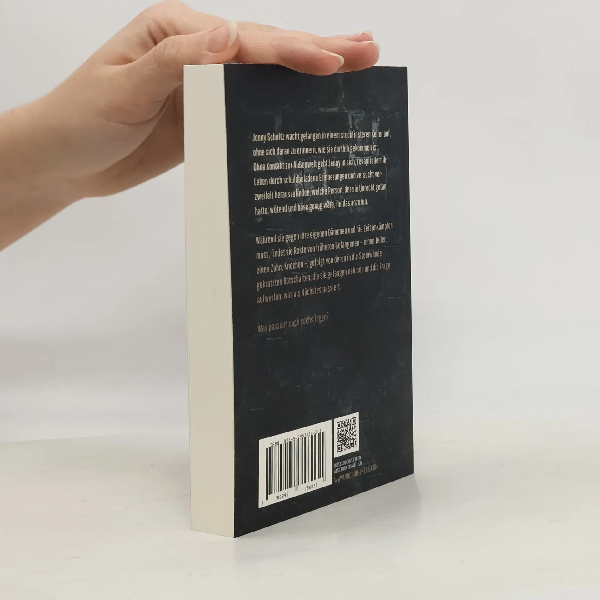 Jenny Schultz wacht in einem dunklen Keller auf, ohne Erinnerungen an ihre Entführung. Gefangen in ihrer Isolation, reflektiert sie über ihr Leben und sucht nach der Person, die ihr das antun könnte. Während sie gegen ihre inneren Dämonen kämpft, entdeckt sie Überreste früherer Gefangener und deren Botschaften. Was geschieht nach sechs Tagen?