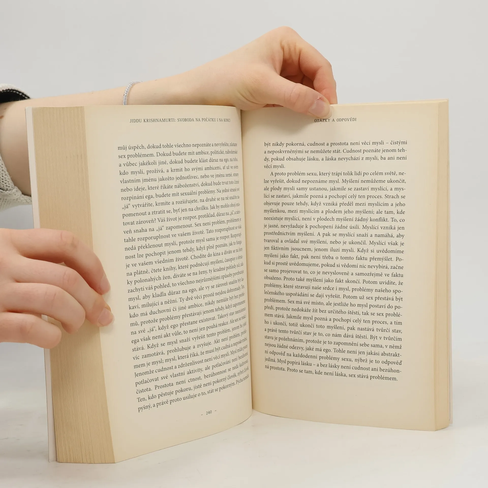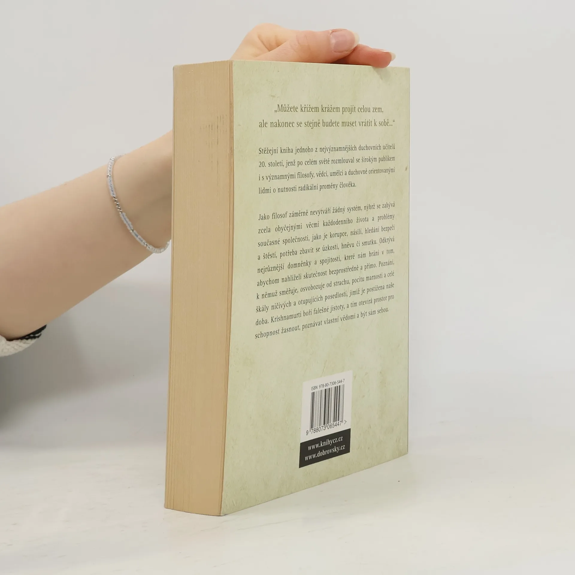 Stěžejní kniha jednoho z nejvýznamnějších duchovních učitelů 20. století, jenž po celém světě rozmlouval s širokým publikem i s významnými filosofy, vědci, umělci a duchovními lidmi o potřebě radikální proměny člověka. Jako filosof záměrně nevytvářel žádný žádný systém, nýbrž se zabýval zcela obyčejnými věcmi každodenního života a problémy současné společnosti, jako je korupce, násilí, hledání bezpečí a štěstí, potřeba zbavit se strachu, hněvu, smutku. Přístupnou formou, leč velmi poctivě a důkladně zkoumá jemné uzpůsobení lidské mysli a ukazuje, že meditativně duchovní rozměr dává člověku svobodu, která je nezbytná, abychom mohli skutečně být sami sebou. Kniha je určena každému, kdo se ocitl na křižovatce a potřebuje v životě najít nějaký opěrný bod. Krishnamurti odkrývá nejrůznější domněnky a spojitosti, které dusí naši schopnost nahlížet skutečnost bezprostředně a přímo. Poznání, k němuž směřuje, osvobozuje od strachu, nudy, pocitu marnosti a celé škály ničivých, otupujících posedlostí, jimiž je postižena naše doba. Tato kniha nevšedních úvah a rozhovorů čtenáře jemně vede k novým a pronikavým vhledům, které mají hluboký osvobozující účinek. Boří falešné jistoty, a tím otevírá prostor pro schopnost žasnout, bezprostředně poznávat vlastní vědomí a důvěřovat své vlastní jedinečné zkušenosti.