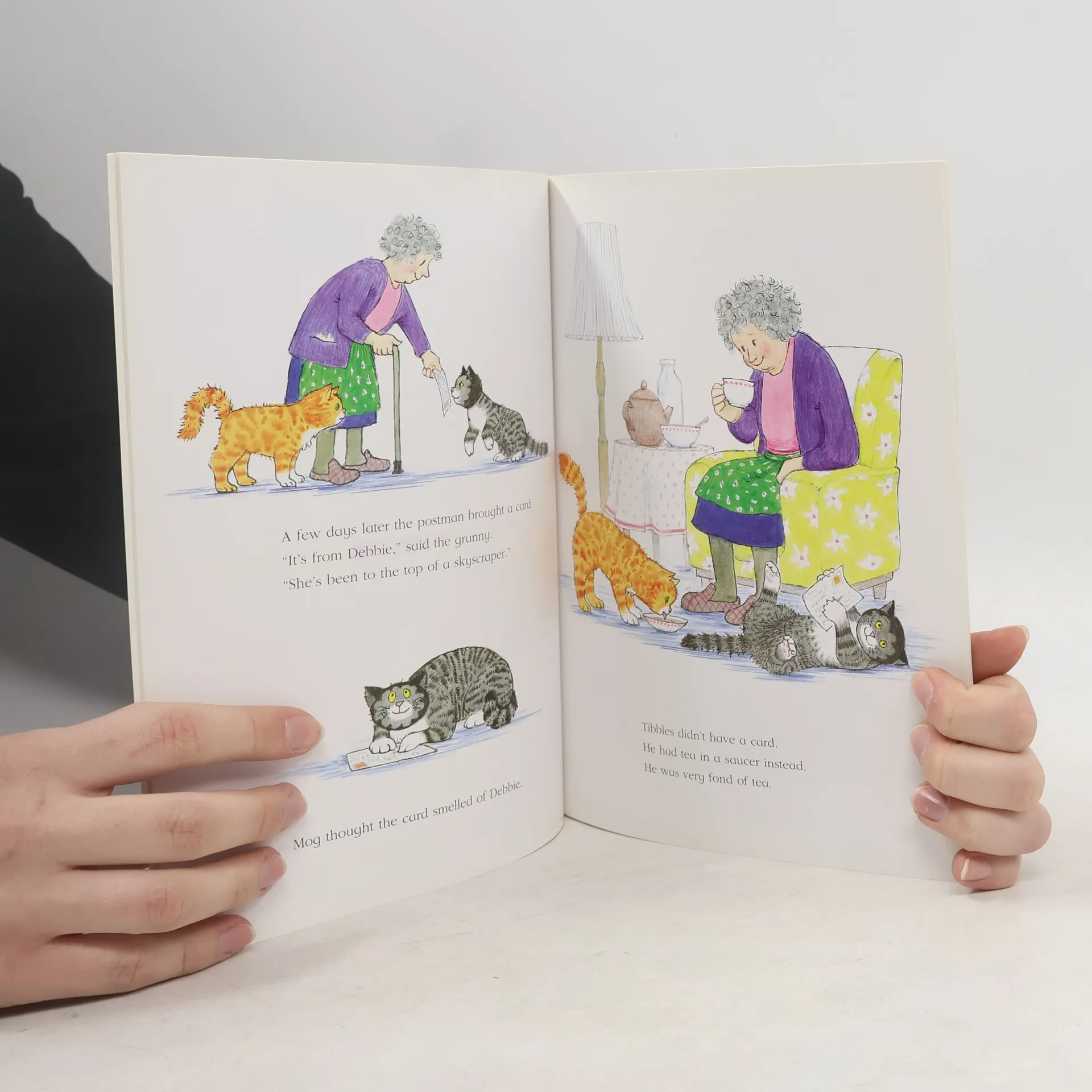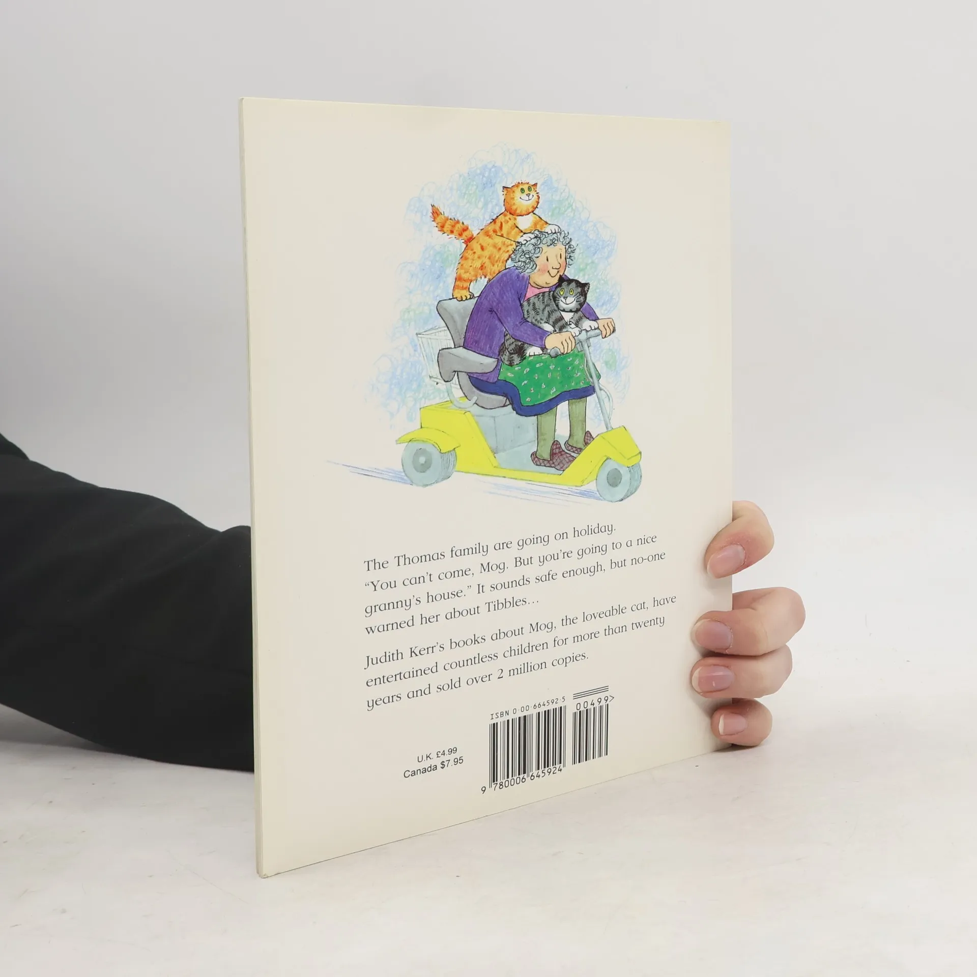 When the Thomas's go away on holiday, Mog stays with a nice old granny. Mog misses Debbie and dreams she is coming home. I must be there to meet her, thinks Mog and off she goes. On the way, a dog chases Mog up a tree. The granny comes to the rescue - just in the nick of time.