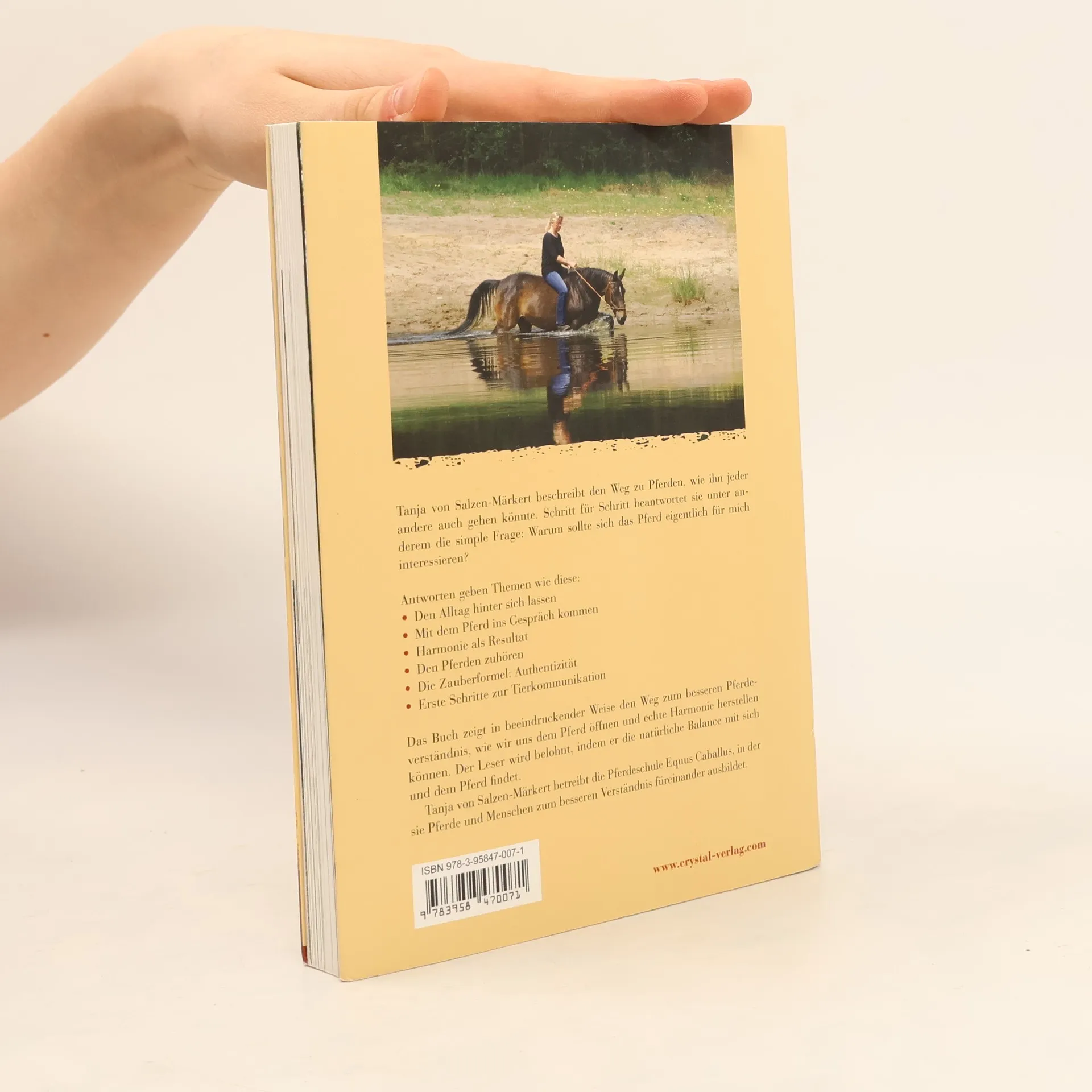 Tanja von Salzen-Märkert beschreibt den Weg zu Pferden, wie ihn jeder andere auch gehen könnte. Schritt für Schritt beantwortet sie unter an-derem die simple Frage: Warum sollte sich das Pferd eigentlich für mich interessieren? Antworten geben Themen wie diese: Den Alltag hinter sich lassen Mit dem Pferd ins Gespräch kommen Harmonie als Resultat Den Pferden zuhören Die Zauberformel: Authenzität Erste Schritte zur Tierkommunikation Das Buch zeigt in beeindruckender Weise den Weg zum besseren Pferde-verständnis, wie wir uns dem Pferd öffnen und echte Harmonie herstellen können. Der Leser wird belohnt, indem er die natürliche Balance mit sich und dem Pferd findet. Tanja von Salzen-Märkert betreibt die Pferdeschule Equus Caballus, in der sie Pferde und Menschen zum besseren Verständnis füreinander ausbil-det.