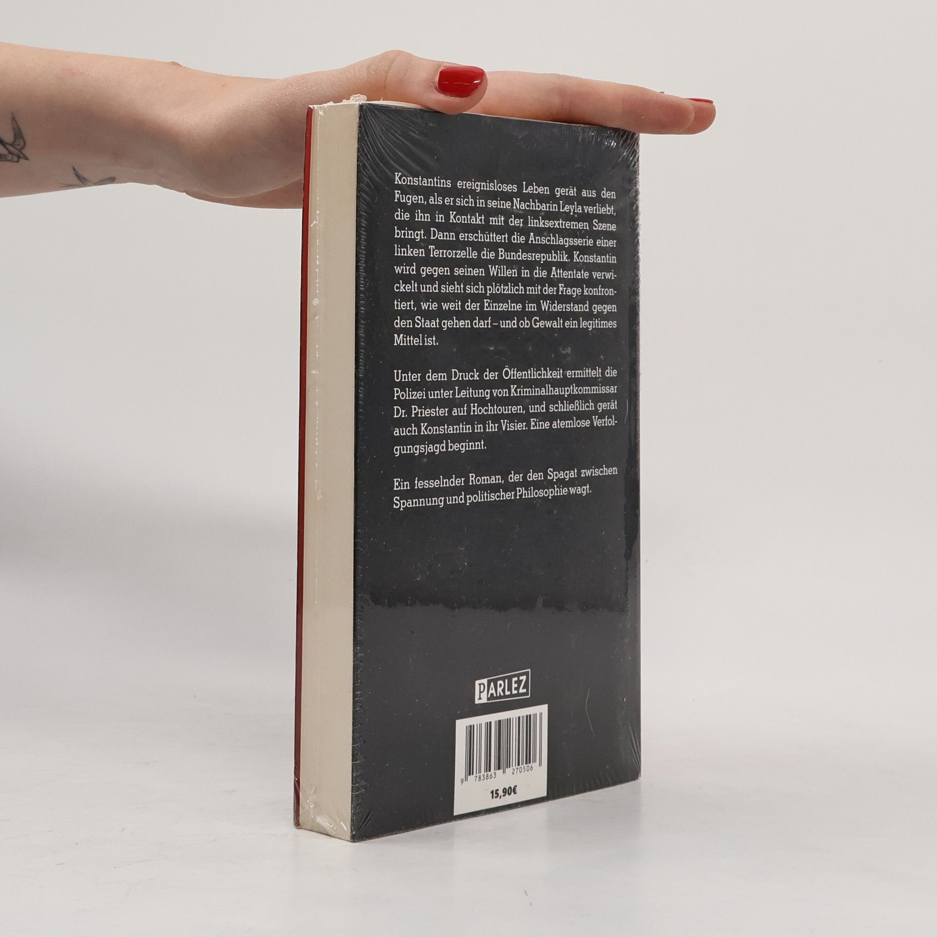 Konstantins ereignisloses Leben gerät aus den Fugen, als er sich in seine Nachbarin Leyla verliebt, die ihn in Kontakt mit der linksextremen Szene bringt. Dann erschüttert die Anschlagsserie einer linken Terrorzelle die Bundesrepublik. Konstantin wird gegen seinen Willen in die Attentate verwickelt und sieht sich plötzlich mit der Frage konfrontiert, wie weit der Einzelne im Widerstand gegen den Staat gehen darf – und ob Gewalt ein legitimes Mittel ist. Unter dem Druck der Öffentlichkeit ermittelt die Polizei unter Leitung von Kriminalhauptkommissar Dr. Priester auf Hochtouren, und schließlich gerät auch Konstantin in ihr Visier. Eine atemlose Verfolgungsjagd beginnt. Ein fesselnder Roman, der den Spagat zwischen Spannung und politischer Philosophie wagt.