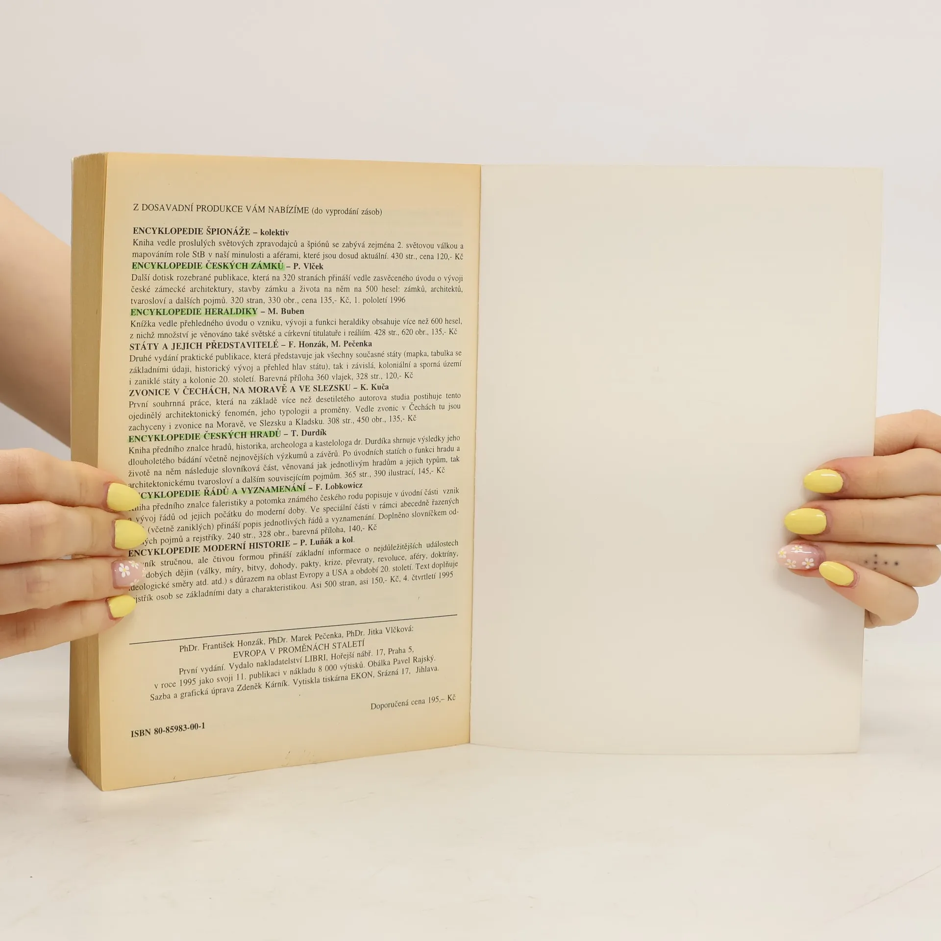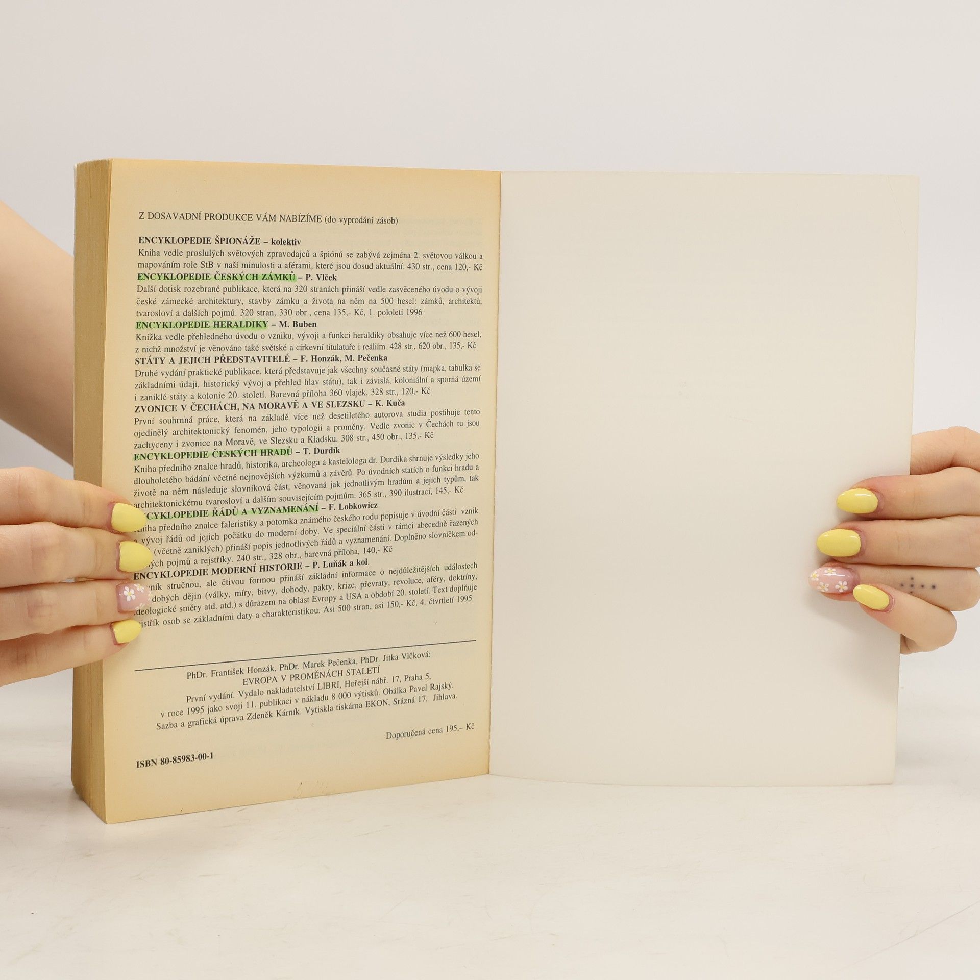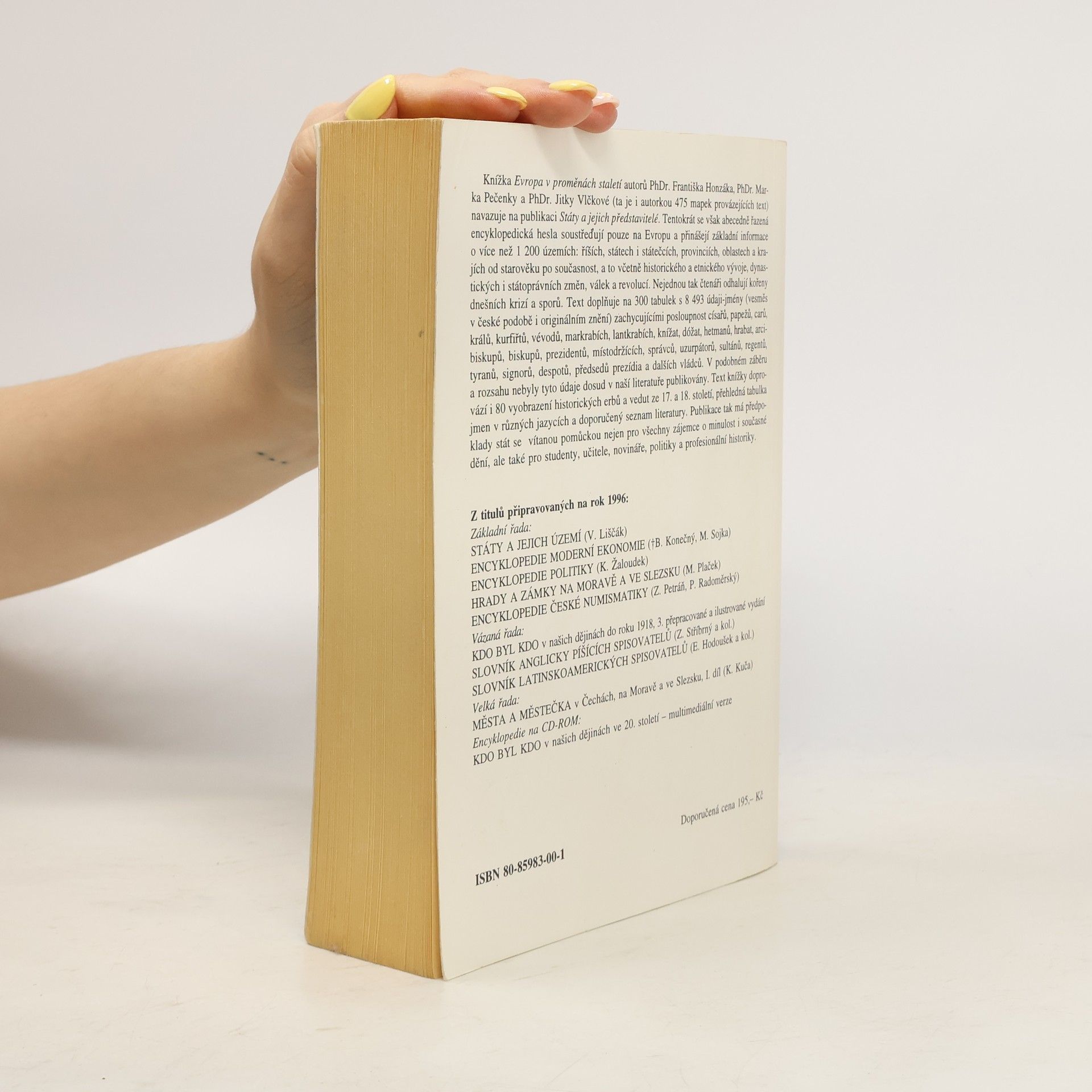 Knížka Evropa v proměnách staletí autorů PhDr. Františka Honzáka, PhDr. Marka Pečenky a PhDr. Jitky Vlčkové (ta je i autorkou 475 mapek provázejících text) navazuje na publikaci Státy a jejich představitelé. Tentokrát se však abecedně řazená encyklopedická hesla soustřeďují pouze na Evropu a přinášejí základní informace o více než 1200 územích: říších, státech i státečcích, provinciích, oblastech a krajích od starověku po současnost, a to včetně historického a etnického vývoje, dynastických i státoprávních změn, válek a revolucí. Nejednou tak čtenáři odhalují kořeny dnešních krizí a sporů. Text doplňuje na 300 tabulek s 8493 údaji-jmény (vesměs v české podobě i originálním znění) zachycujícími posloupnost císařů, papežů, carů, králů, kurfiřtů, vévodů, markrabích, lantkrabích, knížat, dóžat, hetmanů, hrabat, arcibiskupů, biskupů, prezidentů, místodržících, správců, uzurpátorů, sultánů, regentů, tyranů, signorů, despotů, předsedů prezídia a dalších vládců. V podobném záběru a rozsahu nebyly tyto údaje dosud v naší literatuře publikovány. Text knížky doprovází i 80 vyobrazení historických erbů a vedut ze l7. a 18. století, přehledná tabulka jmen v různých jazycích a doporučený seznam literatury. Publikace tak má předpoklady stát se vítanou pomůckou nejen pro všechny zájemce o minulost i současné dění, ale také pro studenty, učitele, novináře, politiky a profesionální historiky. Vydání první