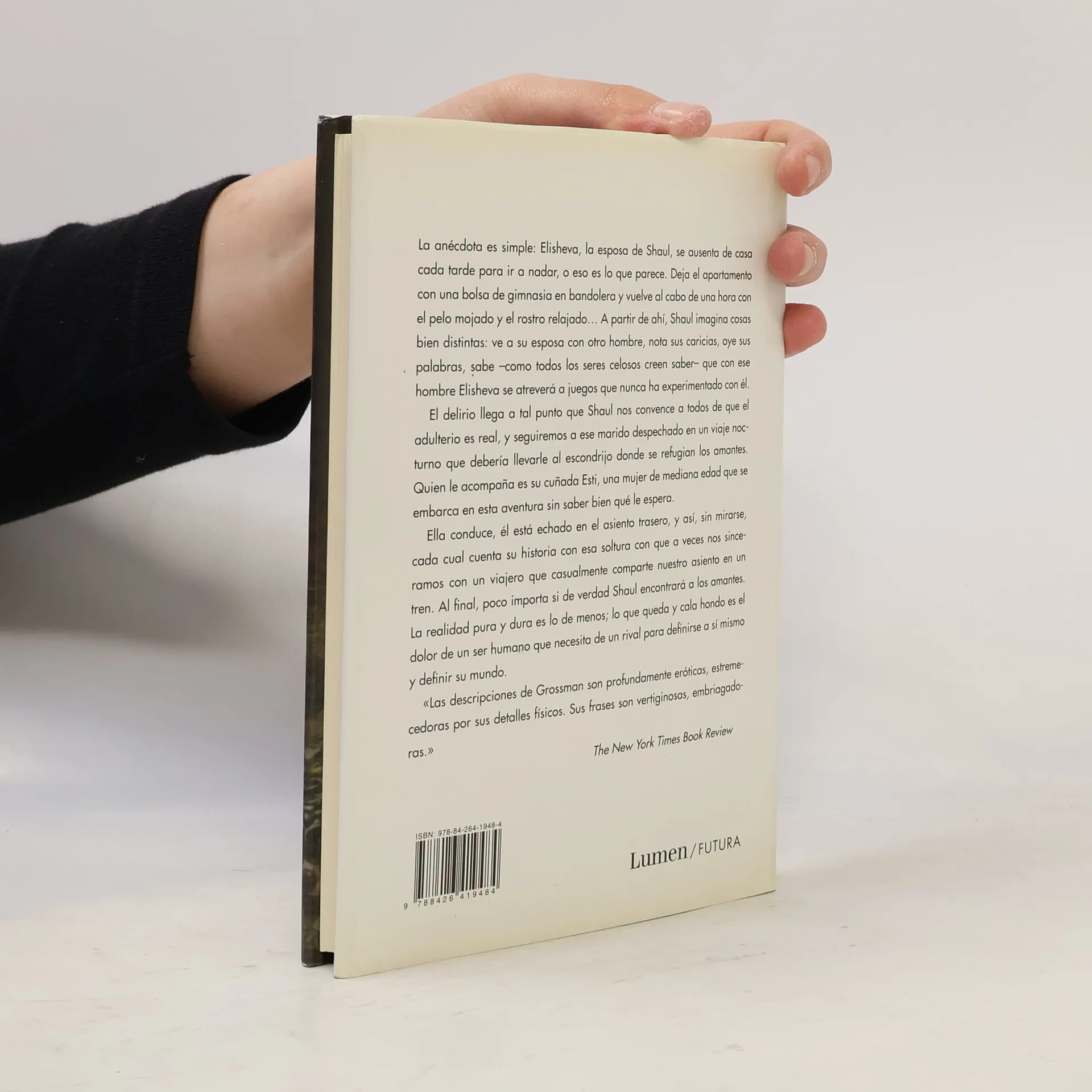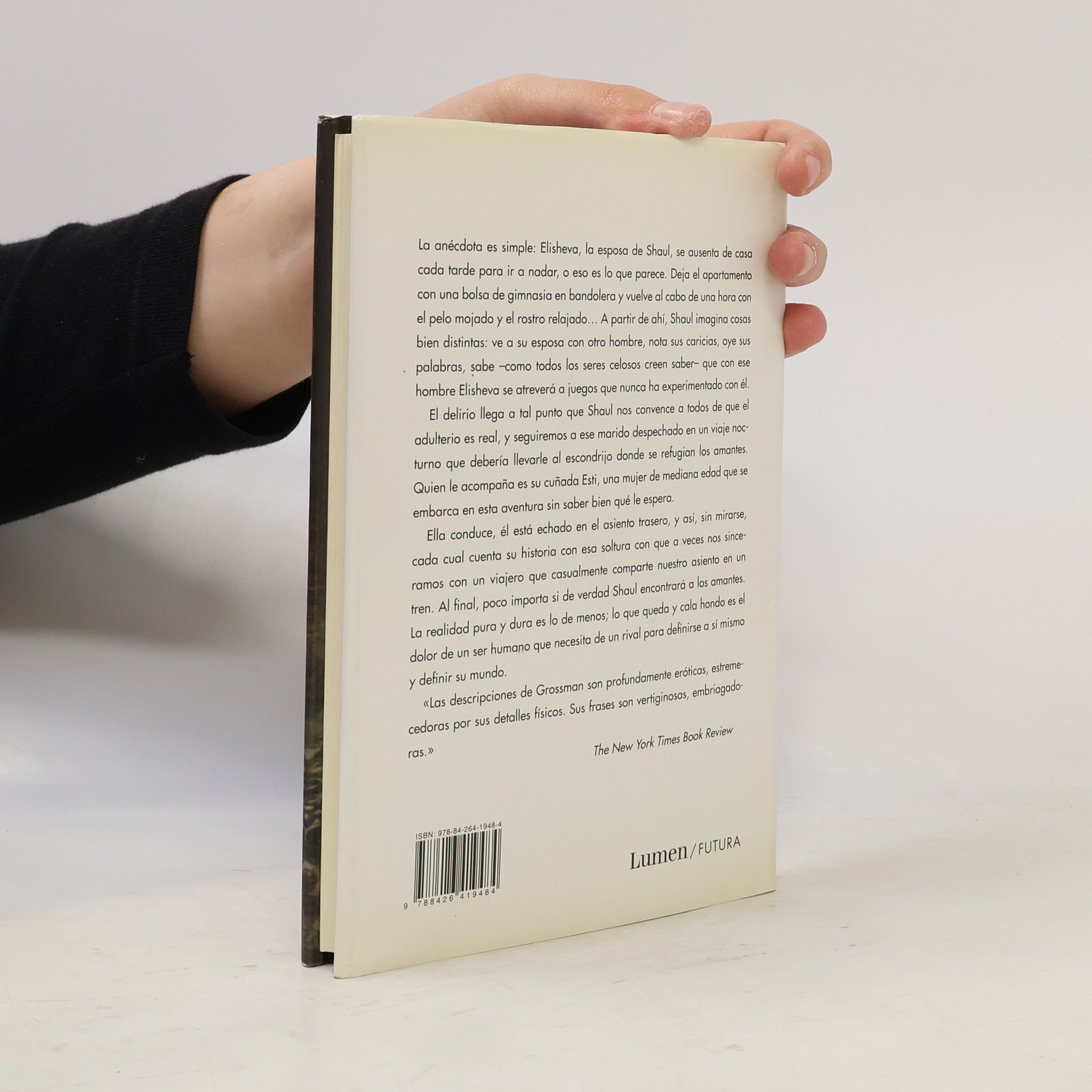 El viaje delirante de un hombre que va en busca de su esposa y del hombre que cree su amante. La anécdota es simple: Elisheva, la esposa de Shaul se ausenta de casa cada tarde para ir a nadar, o eso es lo que ella dice. Deja el apartamento con una bolsa de gimnasia en bandolera y vuelve al cabo de una hora con el pelo mojado y el rostro relajado# A partir de ahí, Shaul imagina cosas bien distintas: ve a su esposa con otro hombre, nota sus caricias, oye sus palabras, sabe #como todos los seres celosos creen saber- que con ese hombre Elisheva se atreverá a juegos que nunca ha experimentado con él. El delirio llega a tal punto que Shaul nos convence a todos de que el adulterio es real, y seguiremos a ese marido despechado en un viaje nocturno que supuestamente le llevará al escondrijo donde se refugian los amantes. Quien le acompaña es su cuñada Esti, una mujer de mediana edad que se embarca en esa aventura sin saber bien qué le espera. Ella conduce, él está echado en el asiento trasero, y así, sin mirarse, cada cual cuenta su historia con esa soltura con que a veces nos sinceramos con un viajero que casualmente comparte nuestro asiento en un tren. Al final, poco importa si de verdad este hombre desesperado encontrará a los amantes. La realidad pura y dura es lo de menos; lo que queda y cala hondo es el dolor de un ser humano que necesita del de un rival para definirse a sí mismo y definir su mundo. #Las descripciones de Grossman son profundamente eróticas, estremecedoras por sus detalles físicos. Sus frases son vertiginosas, e mbriagadoras.# The New York Times Book Review