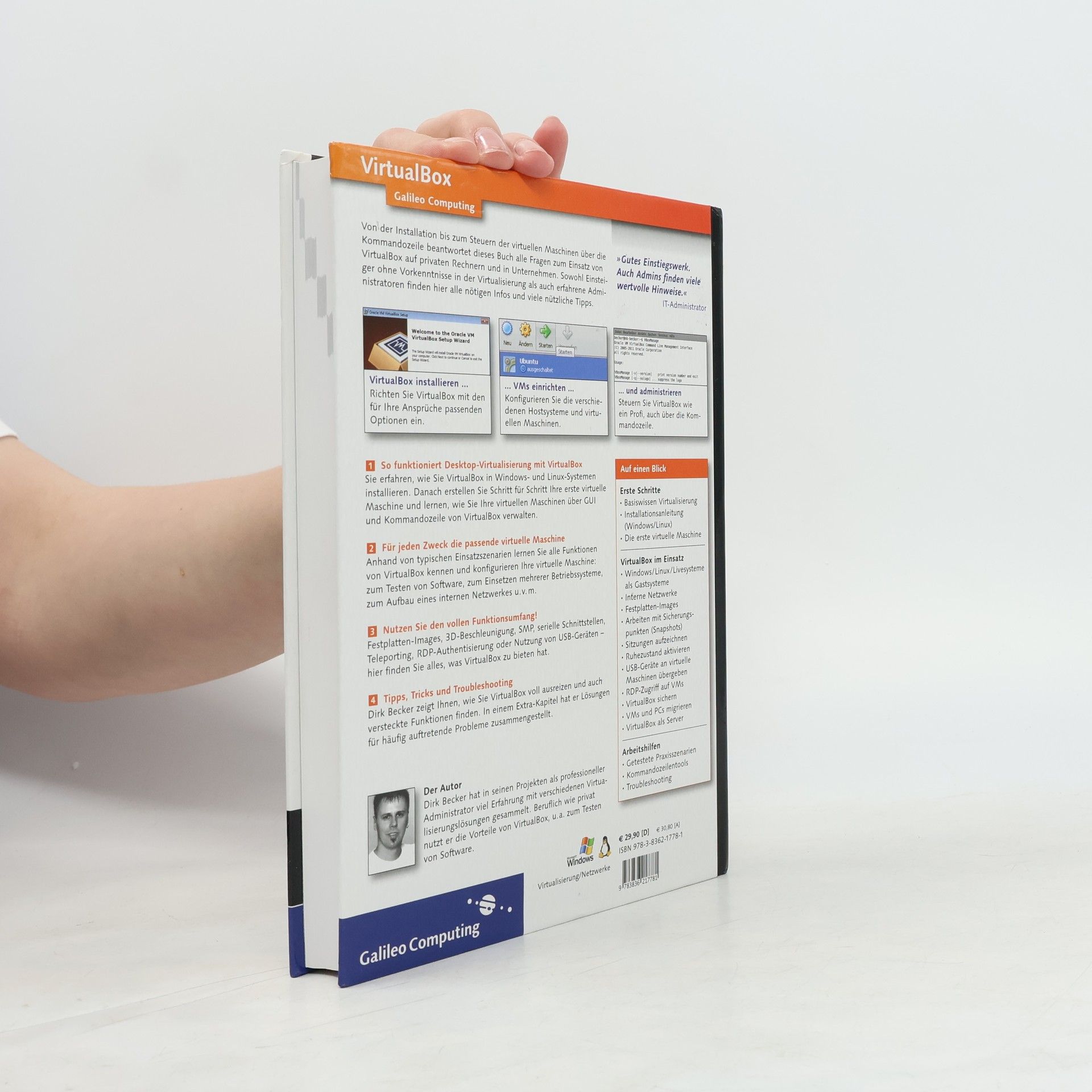 Desktop-Virtualisierung für Einsteiger und Profis! Lernen Sie, wie Sie die leistungsfähige und beliebte Software VirtualBox in der aktuellen Version 4 installieren, anwenden und effizient nutzen. Das Buch richtet sich gezielt an Windows- und Linux-Anwender. Es enthält zahlreiche Tipps und Beispiele zum Migrieren von PCs oder VMs von Fremdsystemen. Es geht sehr praxisorientiert vor und bietet Lösungen für die am häufigsten auftretenden Fehler und Probleme. Von der virtualisierten Hardware und Netzwerken über die GUI und die Installation auf verschiedenen Systemen behandelt das Buch alles, was Sie über Virtualisierung mit VirtualBox wissen müssen. Besonders hilfreich: Nutzen Sie selbst die effizienten Features, die VirtualBox nur über die Kommandozeile anbietet. Die direkt einsetzbaren Befehle liefert Ihnen dieses Buch.