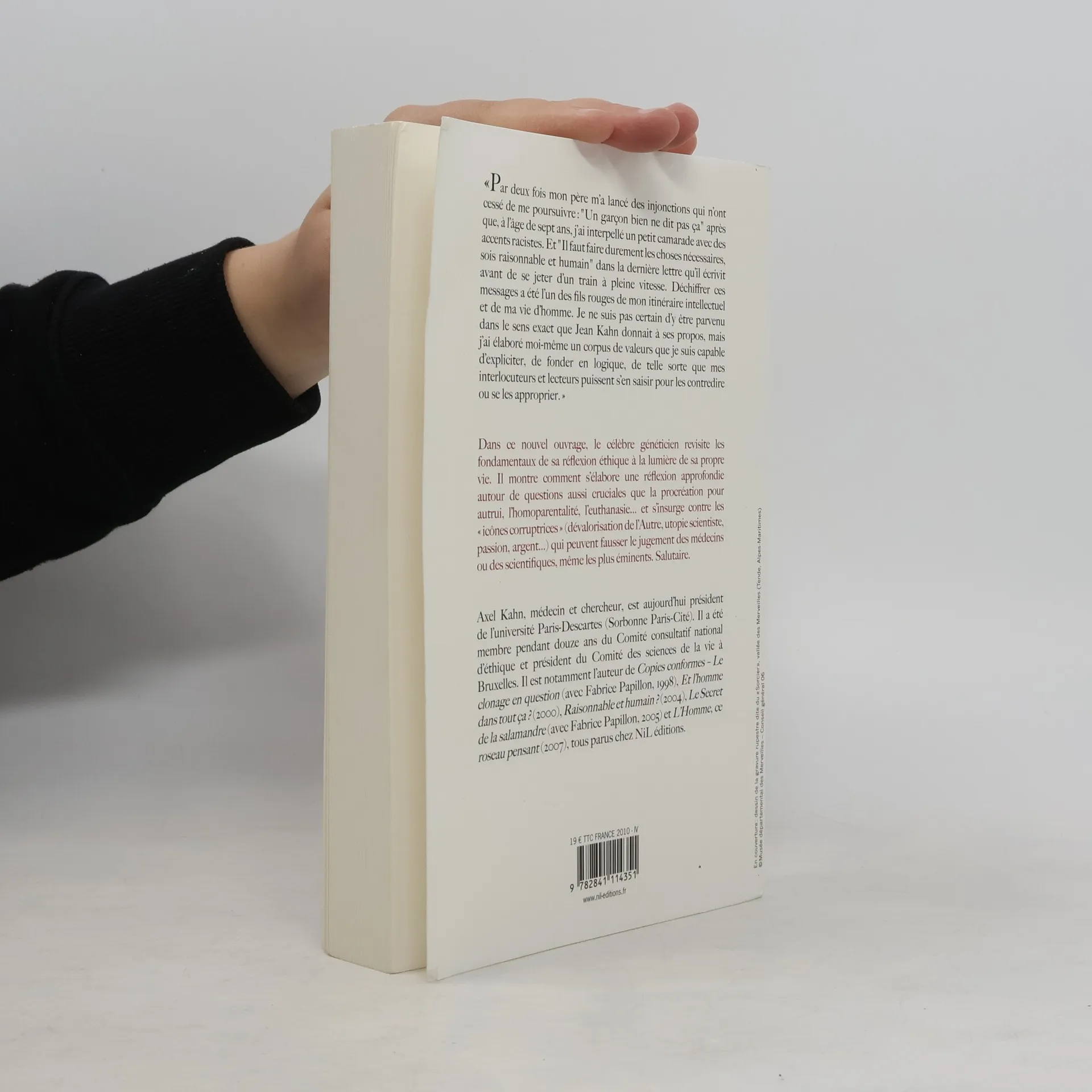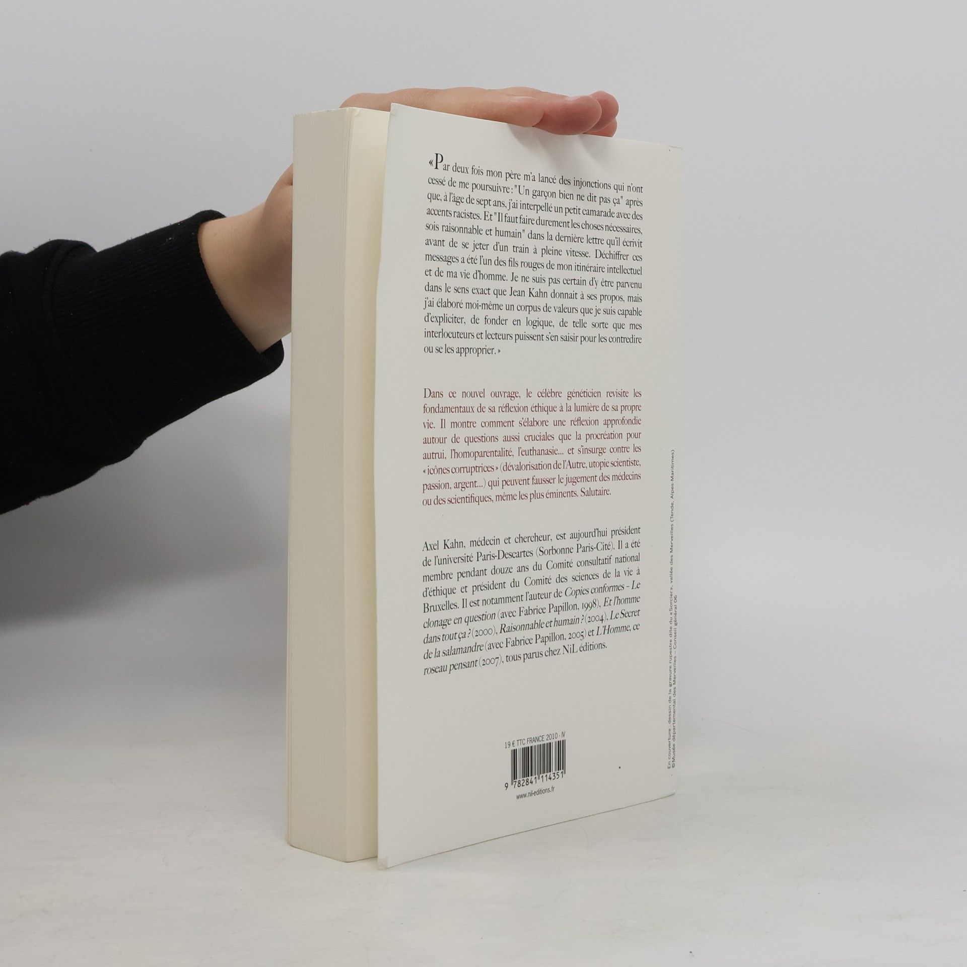 À l'heure de la révision des lois sur la bioéthique, le grand scientifique revient sur son parcours intellectuel et donne sa vision des principes fondateurs de l'éthique.Le célèbre généticien, aujourd'hui président de l'université Paris-V, revisite dans ce nouvel ouvrage les fondements de sa réflexion éthique, à la lumière de sa propre vie. Il prévient d'emblée que l'éthique c'est [sa] " deuxième nature " et qu'il est " incapable d'être politiquement correct "." Tu sais, Axel, un petit garçon bien ne peut pas dire ça. " En citant cette phrase prononcée par son père, après qu'il a, enfant, proféré une injure raciste, Axel Kahn nous fait découvrir, par des éléments biographiques fondamentaux, comment s'est forgée ce qu'il nomme son " édification morale ". Nous comprenons mieux l'influence de sa famille et d'un père adoré, de ses frères, mais aussi d'une mère dont il découvrit la grande intelligence... vers la fin de sa vie. Nous mesurons aussi l'influence d'une éducation chrétienne, puis de son engagement communiste (" camarade docteur ", années 60-80). Ainsi que de son engagement tout court, en tant que médecin, notamment au service des urgences, et lors de son service militaire en Afrique.Face à la marée montante du phénomène de " génétisation " et de " biologisation " de la société, il faut offrir un rempart solide. Médecin devenu chercheur, puis personnalité scientifique très médiatique, Axel Kahn continue, à sa manière, d'être un rebelle, et de cultiver son indépendance d'esprit. Son opposition à un certain discours scientiste, son affirmation que " la valeur scientifique d'une innovation ne la justifie pas sur le plan moral " (clonage thérapeutique), lui a certainement barré les portes de l'Académie, nous confie-t-il. En revanche, cela lui a gagné le cœur des innombrables lecteurs et auditeurs de ses multiples conférences. En tant qu'intellectuel, il sait la responsabilité qu'il continue d'avoir en répondant aux questions très diverses qui inquiètent nos contemporains : faut-il condamner des mères porteuses ? Comment lutter contre la " marchandisation " du corps humain ? Que penser de l'euthanasie ?... Au nom de la " réflexivité " (on ne fait pas à l'autre ce qu'on ne voudrait pas qu'on vous fasse à vous-même), son credo ne varie pas : " Ce qui m'importera toujours, c'est l'importance de l'autre, le combat pour la promotion de l'homme, contre sa stigmatisation. "