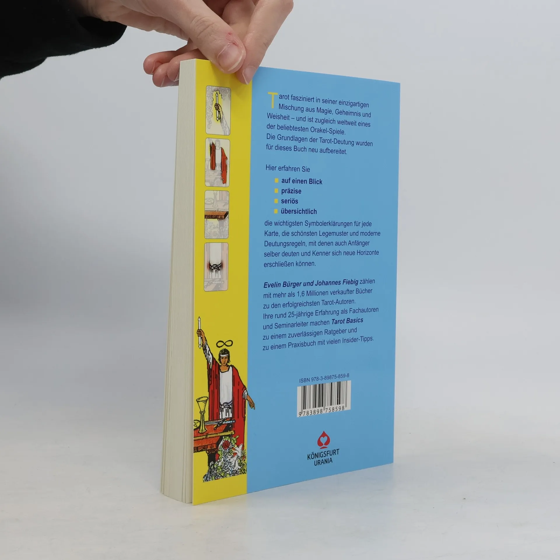 enthält den Erfolgs-Titel Tarot Basis WAITE mit extra-großen Tarot-Karten mit Flyer zum 25-jährigen Autorenjubiläum von Evelin Bürger & Johannes Fiebig 1984 erschien der erste Titel von Bürger / Fiebig: Tarot Spiegel Deiner Möglichkeiten . Ihr vorläufig letztes Werk heißt Tarot Basics , erhältlich in zwei Ausgaben: fürs Rider/Waite- und fürs Crowley-Tarot. Jedes einzelne Kartensymbol wird hier in einer neuartigen Lupentechnik optisch herausgestellt und erklärt. So leicht war Tarot-Deutung noch nie und im Detail noch nie so nachprüfbar. Zwischen dem ersten und dem letzten Opus liegen 25 Jahre gemeinsamen Lebens und Schreibens und die fast unglaubliche Zahl von ca. 1,6 Millionen Tarot-Büchern, die von Bürger / Fiebig in vielen Sprachen erschienen sind.