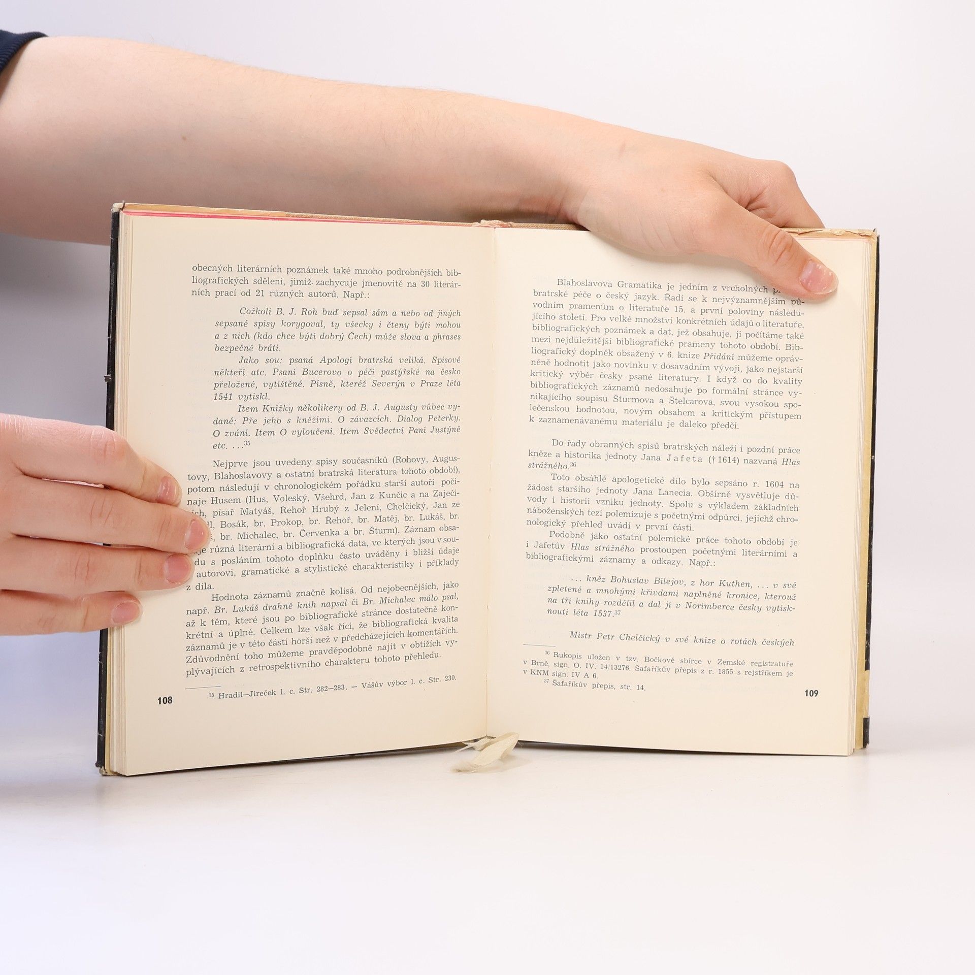 Od nejstarších zpráv o knihách až do r. 1620. Po obecných otázkách dějin české bibliografie probírá autor v pěti časových obdobích jednotlivé literární i jiné prameny a na nich dokládá vývoj bibliografie od nejranějších forem až k prvním samostatným bibliografickým seznamům. Svůj výklad, týkající se i praxe popisu, doplňuje vylíčením hospodářskopolitických i kulturních souvislostí, vedoucích ke vzniku a rozvoji bibliografie u nás.