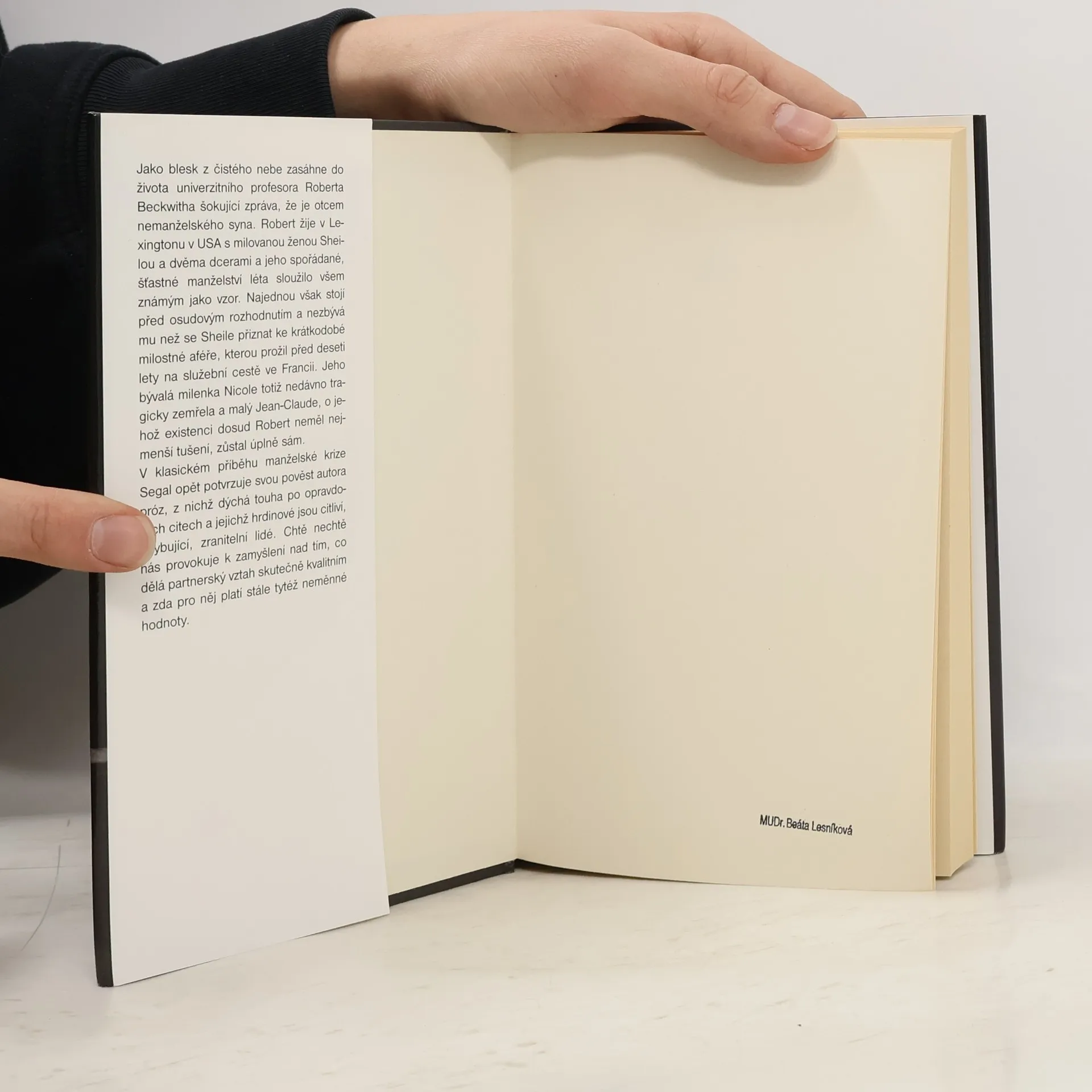 Jako blesk z čistého nebe zasáhne do života univerzitního profesora Roberta Beckwitha šokující zpráva, že je otcem nemanželského syna. Robert žije v Lexingtonu v USA s milovanou ženou Sheilou a dvěma dcerami a jeho spořádané, šťastné manželství léta sloužilo všem známým jako vzor. Najednou však stojí před osudovým rozhodnutím a nezbývá mu než se Sheile přiznat ke krátkodobé milostné aféře, kterou prožil před deseti roky na služební cestě ve Francii. Jeho bývalá milenka Nicole totiž nedávno tragicky zemřela a malý Jean-Claude, o jehož existenci dosud Robert neměl nejmenší tušení, zůstal úplně sám. V klasickém příběhu manželské krize Segal opět potvrzuje svou pověst autora próz, z nichž dýchá touha po opravdových citech a jejichž hrdinové jsou citliví, chybující, zranitelní lidé. Chtě nechtě nás provokuje k zamyšlení nad tím, co dělá partnerský vztah skutečně kvalitním a zda pro něj platí stále tytéž neměnné hodnoty.