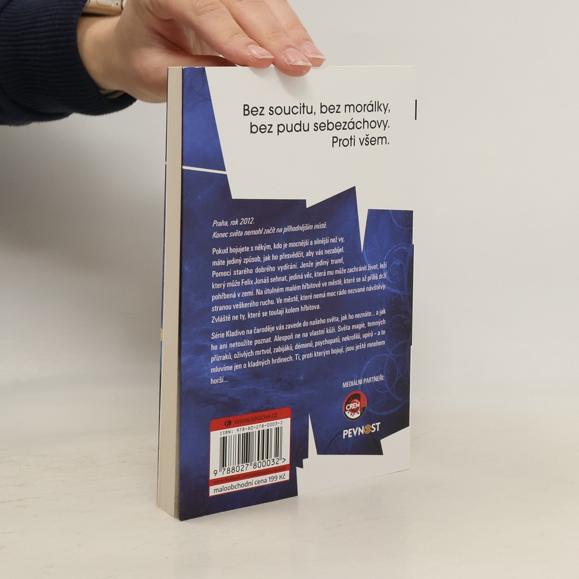 Praha, rok 2012. Konec světa nemohl začít na příhodnějším místě. Pokud bojujete s někým, kdo je mocnější a silnější než vy, máte jediný způsob, jak ho přesvědčit, aby vás nezabíjel. Pomocí starého dobrého vydírání. Jenže jediný trumf, který může Felix Jonáš sehnat, jediná věc, která mu může zachránit život, leží pohřbená v zemi. Na útulném malém hřbitově ve městě, které se až příliš drží stranou veškerého ruchu. Ve městě, které nemá moc rádo nezvané návštěvy. Zvláště ne ty, které se toulají kolem hřbitova. Série Kladivo na čaroděje vás zavede do našeho světa, jak ho neznáte… a jak ho ani netoužíte poznat. Alespoň ne na vlastní kůži. Světa magie, temných přízraků, oživlých mrtvol, zabijáků, démonů, psychopatů, nekrofilů, upírů – a to mluvíme jen o kladných hrdinech. Ti, proti kterým bojují, jsou ještě mnohem horší…