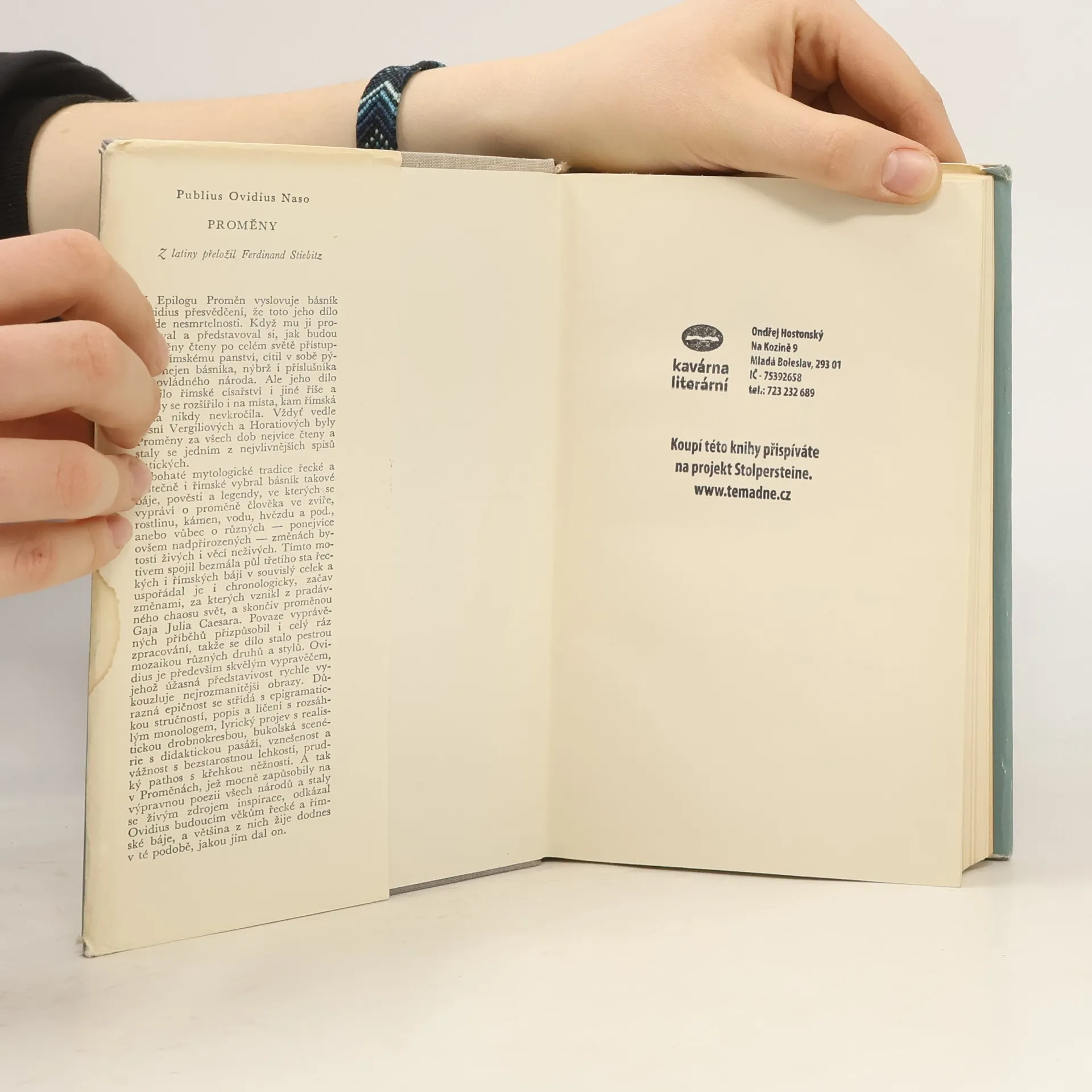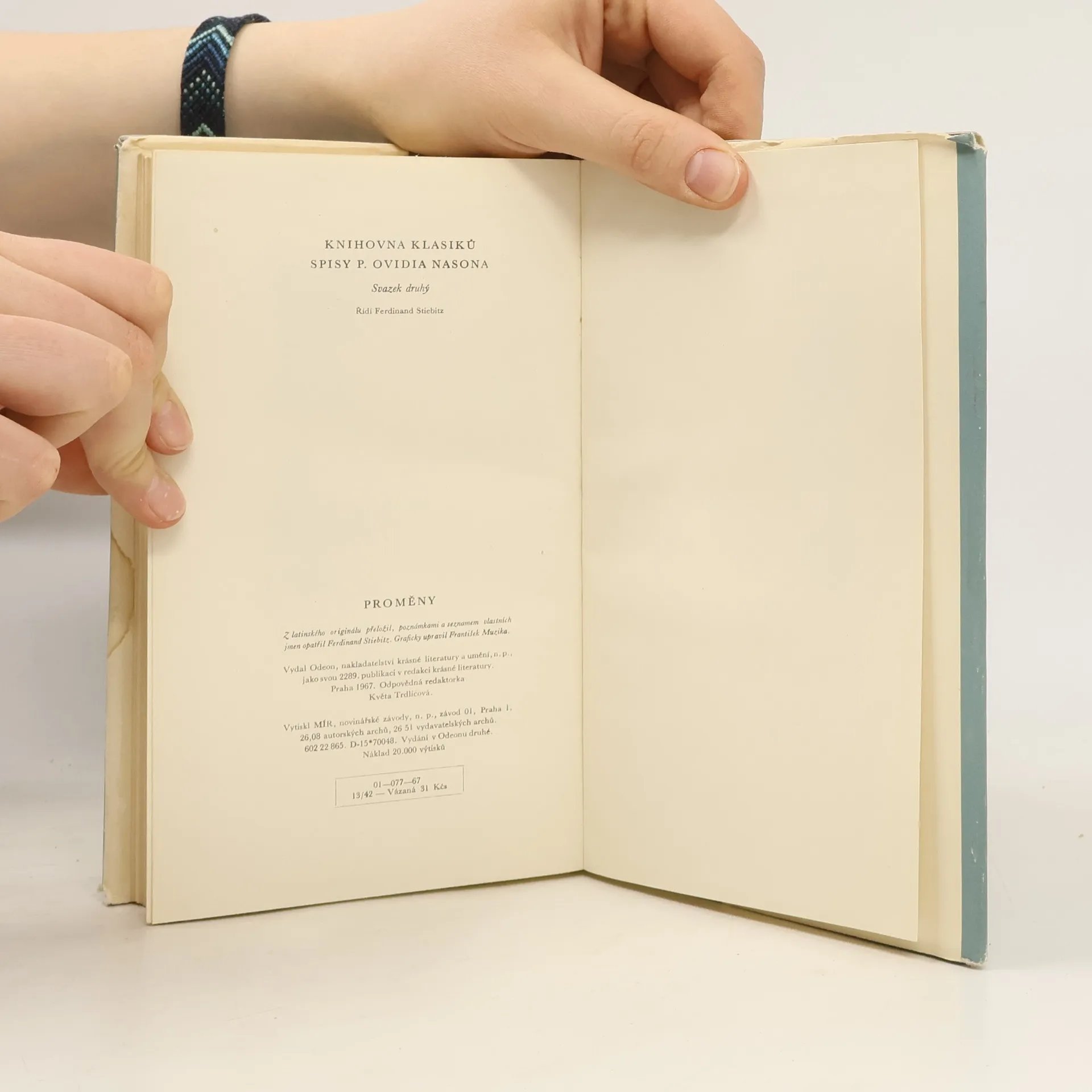 Nesmrtelné Ovidiovy Proměny jsou jedním z nejčtenějších a nejvlivnějších antických spisů. Z bohaté mytologické tradice řecké a částečně i římské básník vybral a v Metamorfózách zpracoval takové báje, pověsti a legendy, v nichž se vypráví o proměně člověka ve zvíře, rostlinu,kámen, hvězdu nebo o různých nadpřirozených změnách bytostí i věcí. Dílo zásadně ovlivnilo evropskou kulturu a stalo se živým zdrojem inspirace v následujících staletích. Vydání z roku 1967 vyšlo jako druhý svazek edice Spisy P. Ovidia Nasona v rámci Knihovny klasiků. Kniha obsahuje i rozsáhlý poznámkový aparát a seznam vlastních jmen.