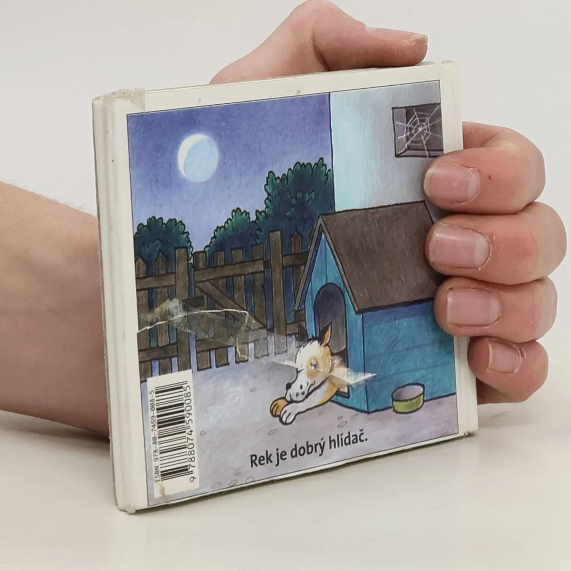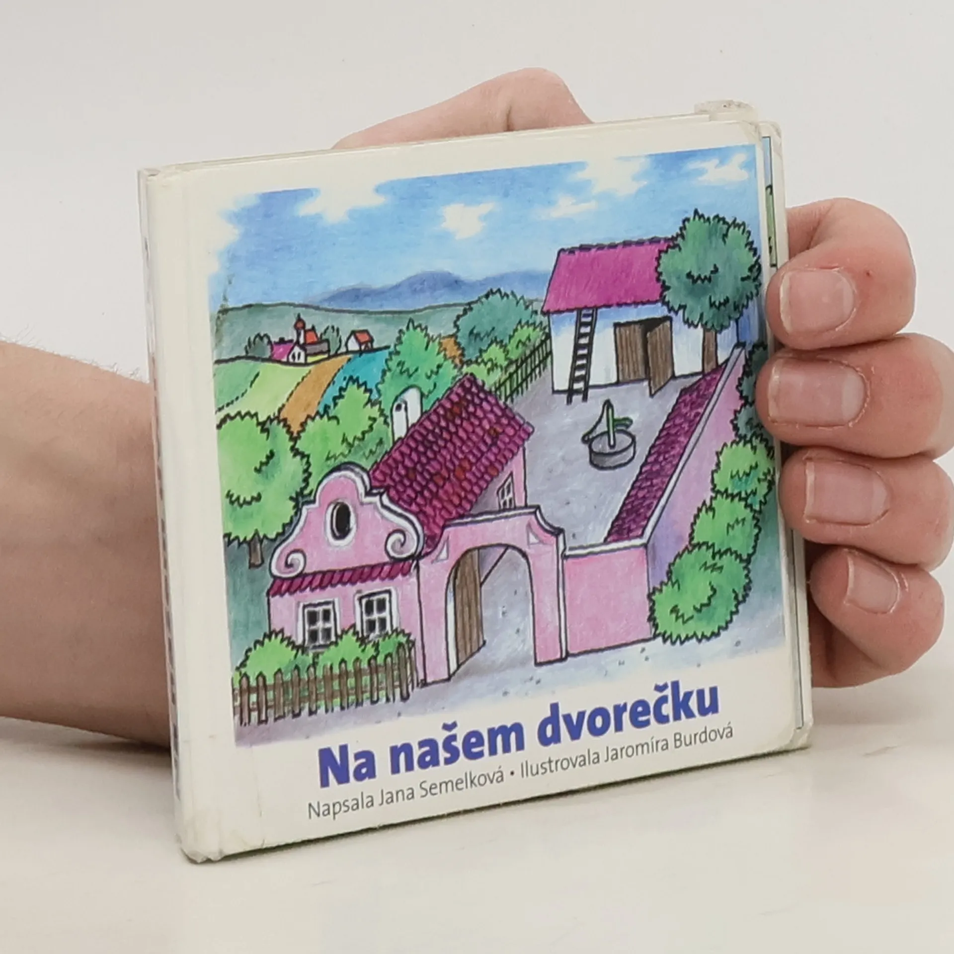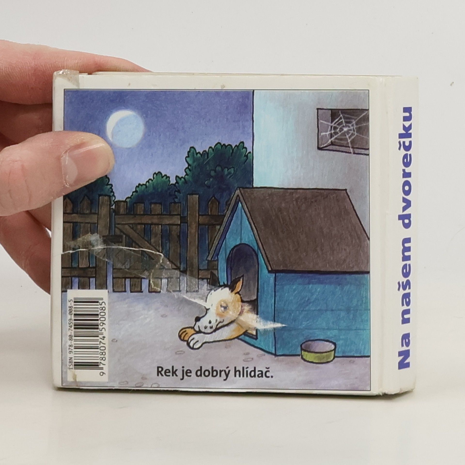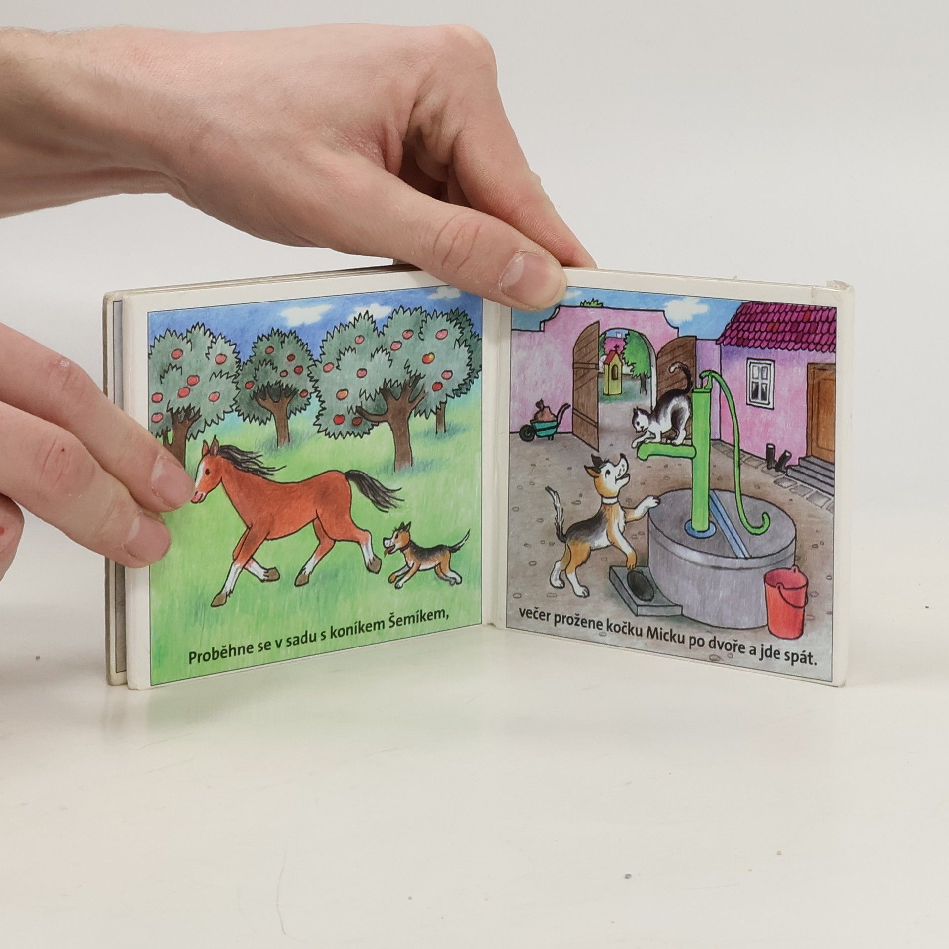 Klasické dětské rozkládací leporelo z pevného kartónu. Jednoduché říkanky o pejskovi a jeho setkání se zvířátky na dvorku.