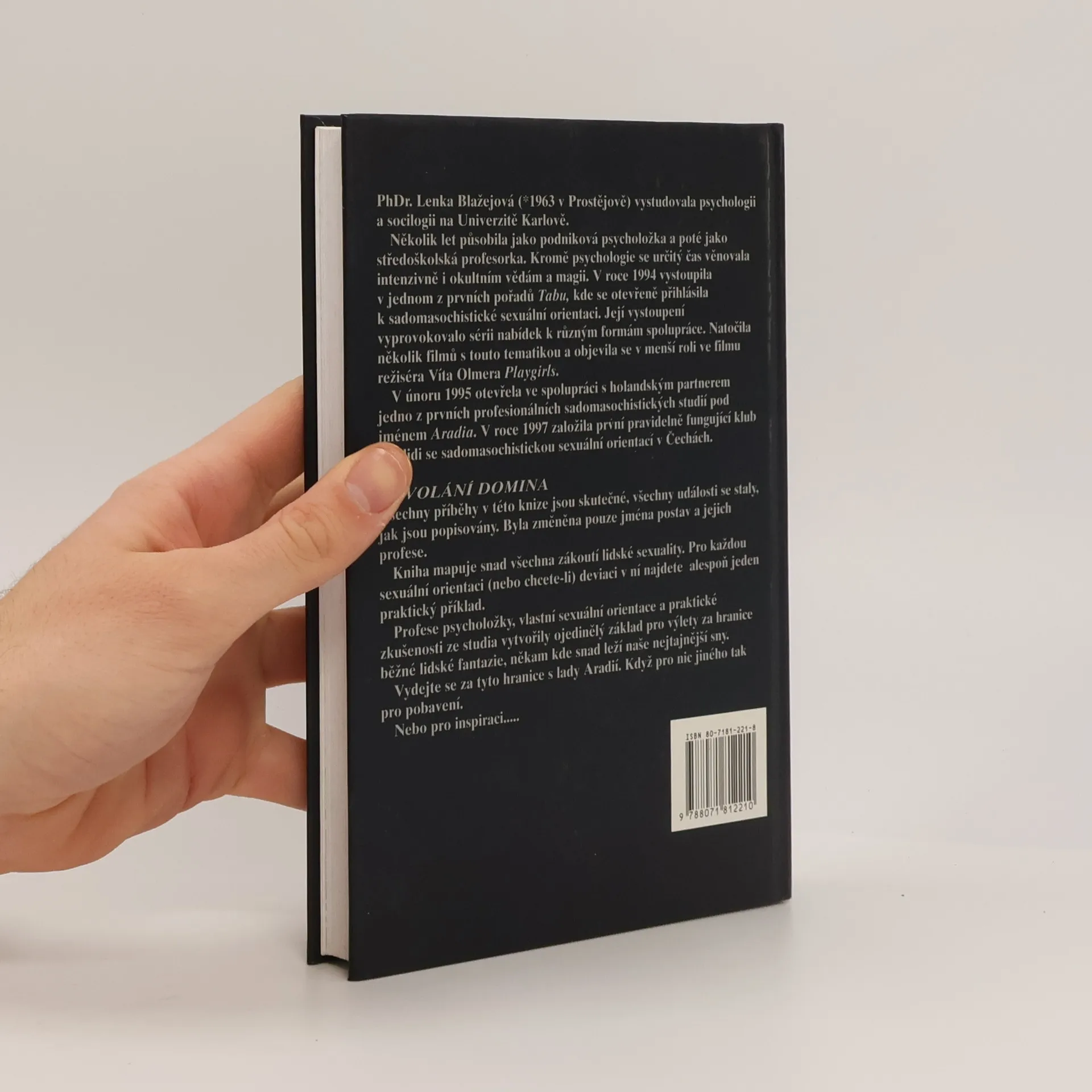 Příběhy ze sadomasochistického studia přinášejí autentické zážitky a události, které se skutečně staly, přičemž byla změněna pouze jména postav a jejich profese. Autorka, PhDr. Lenka Blažejová, vystudovala psychologii a sociologii na Univerzitě Karlově a působila jako podniková psycholožka a profesorka. V roce 1994 se otevřeně přihlásila k sadomasochistické sexuální orientaci v pořadu Tabu, což vedlo k různým nabídkám spolupráce a natáčení filmů na toto téma. V roce 1995 otevřela jedno z prvních profesionálních sadomasochistických studií v Čechách a v roce 1997 založila první pravidelně fungující klub pro lidi se sadomasochistickou orientací. Kniha zkoumá široké spektrum lidské sexuality a pro každou orientaci či deviaci nabízí praktické příklady. Blažejová kombinuje svou profesi psycholožky, osobní zkušenosti a znalosti, aby čtenáře zavedla za hranice běžné fantazie do oblasti nejtajnějších snů. Vydejte se na tuto cestu s lady Aradií, ať už pro pobavení, nebo pro inspiraci.