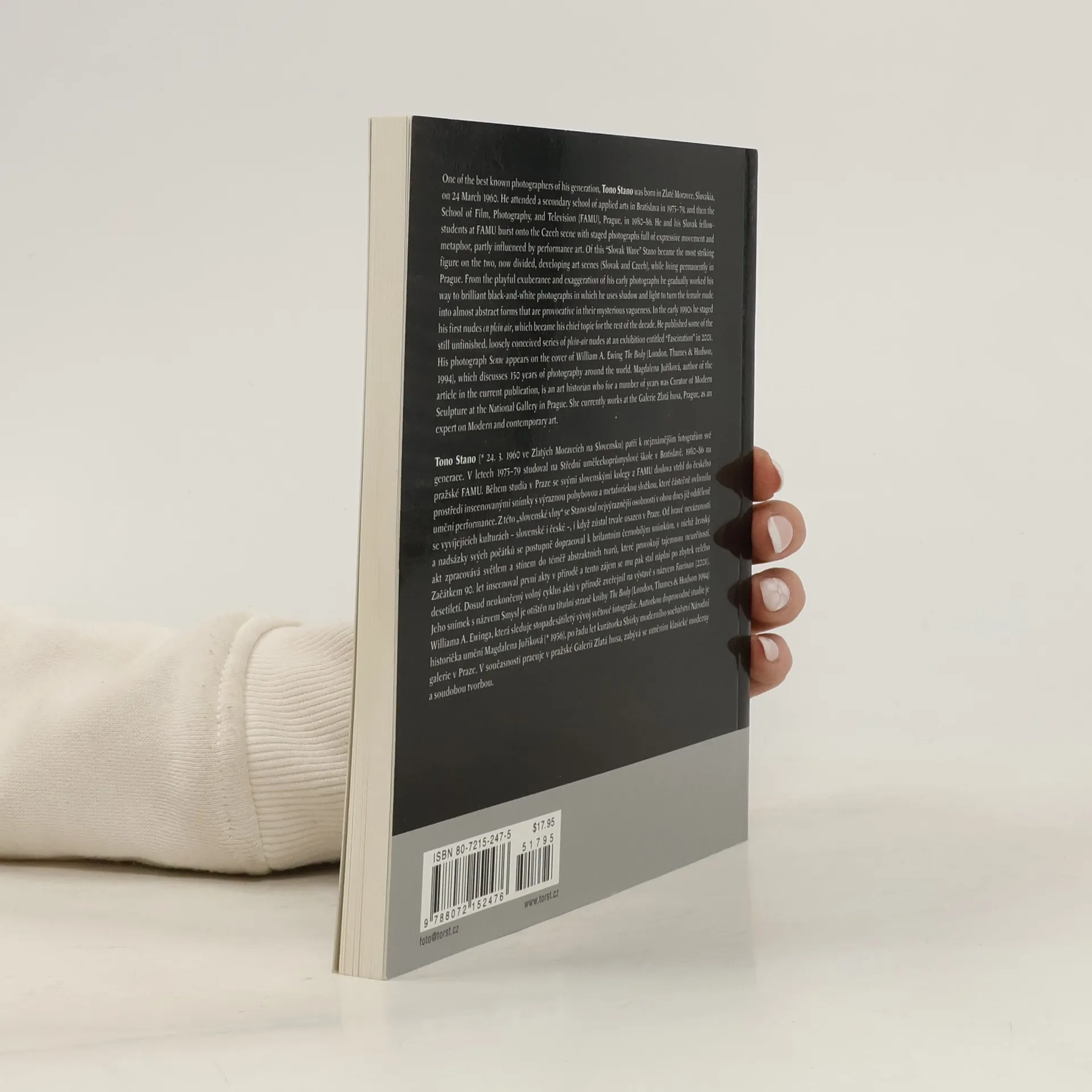Devatenáctý svazek edice Fototorst. Tono Stano (* 24. 3. 1960 ve Zlatých Moravcích na Slovensku) patří k nejznámějším fotografům své generace. V letech 1975–79 studoval na Střední uměleckoprůmyslové ąkole v Bratislavě, 1980–86 na pražské FAMU. Během studia v Praze se svými slovenskými kolegy z FAMU doslova vtrhl do českého prostředí inscenovanými snímky s výraznou pohybovou a metaforickou složkou, které částečně ovlivnilo umění performance. Z této „slovenské vlny“ se Stano stal nejvýraznějąí osobností v obou dnes již odděleně se vyvíjejících kulturách – slovenské i české –, i když zůstal trvale usazen v Praze. Od hravé nevázanosti a nadsázky svých počátků se postupně dopracoval k brilantním černobílým snímkům, v nichž ženský akt zpracovává světlem a stínem do téměř abstraktních tvarů, které provokují tajemnou neurčitostí. Začátkem 90. let inscenoval první akty v přírodě a tento zájem se mu pak stal náplní po zbytek celého desetiletí. Dosud neukončený volný cyklus aktů v přírodě zveřejnil na výstavě s názvem Fascinace (2001). Autorkou doprovodné studie je historička umění Magdalena Juříková (* 1956), po řadu let kurátorka Sbírky moderního sochařství Národní galerie v Praze. V současnosti pracuje v pražské Galerii Zlatá husa, zabývá se uměním klasické moderny a soudobou tvorbou.