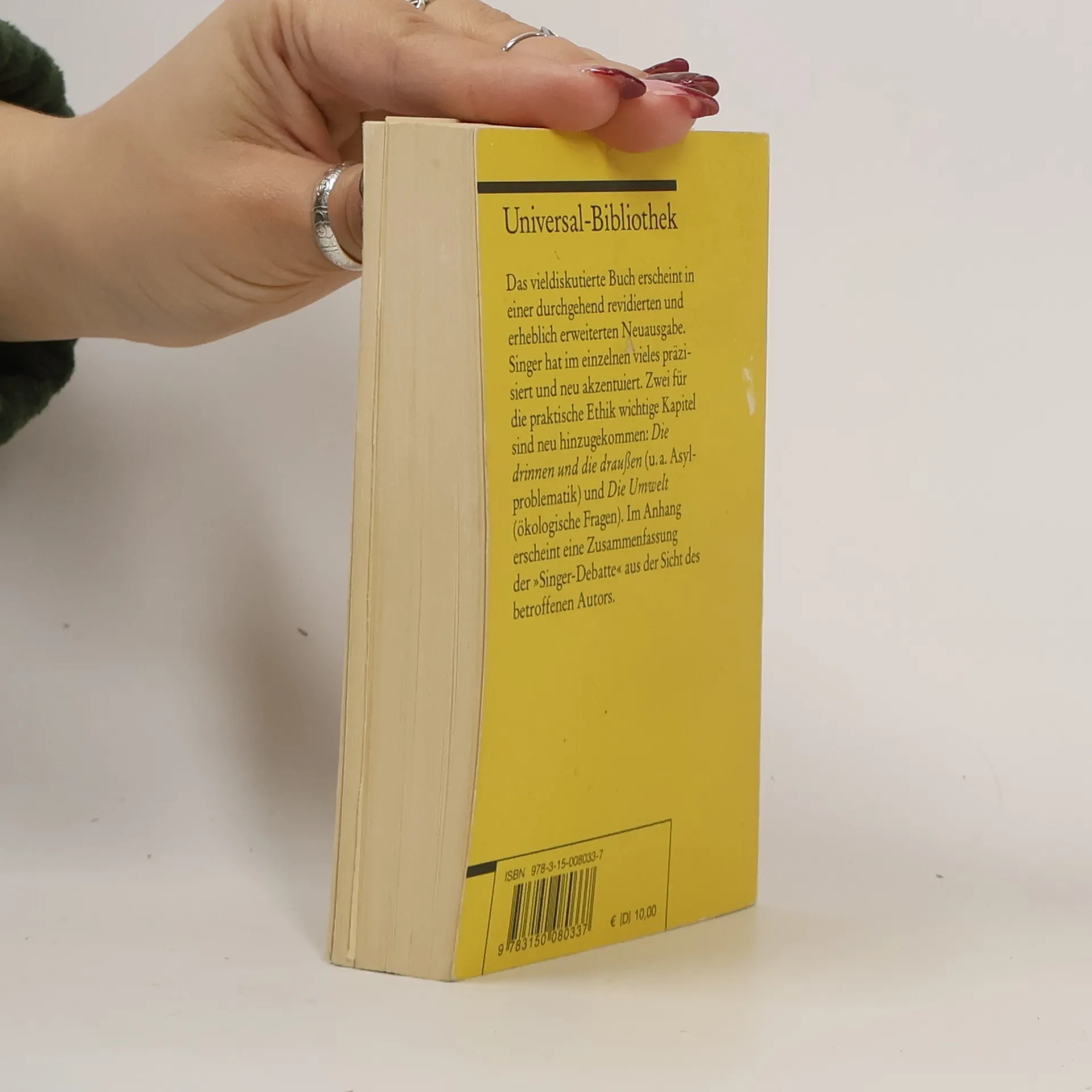 Peter Singers »Praktische Ethik«, 1979 in erster Auflage erschienen, ist in seiner ebenso präzisen wie nachvollziehbaren Argumentationsstruktur ein Musterbeispiel für klares, philosophisches Denken. Besonders wichtig ist der von Singer eingeführte Begriff des Speziesismus (Menschen denken über Tiere anders, weil Tiere keine Menschen sind, obwohl es sachlich begründete Argumente gibt, genau dies nicht zu tun). Für Kontroversen sorgten seine Theorien über Sterbehilfe und Euthanasie. Für diese dritte Auflage hat der Autor den Band komplett durchgearbeitet und um ein neues Kapitel über den Klimawandel und die sich aus diesem ergebenden Verpflichtungen gegenüber kommenden Generationen ergänzt.