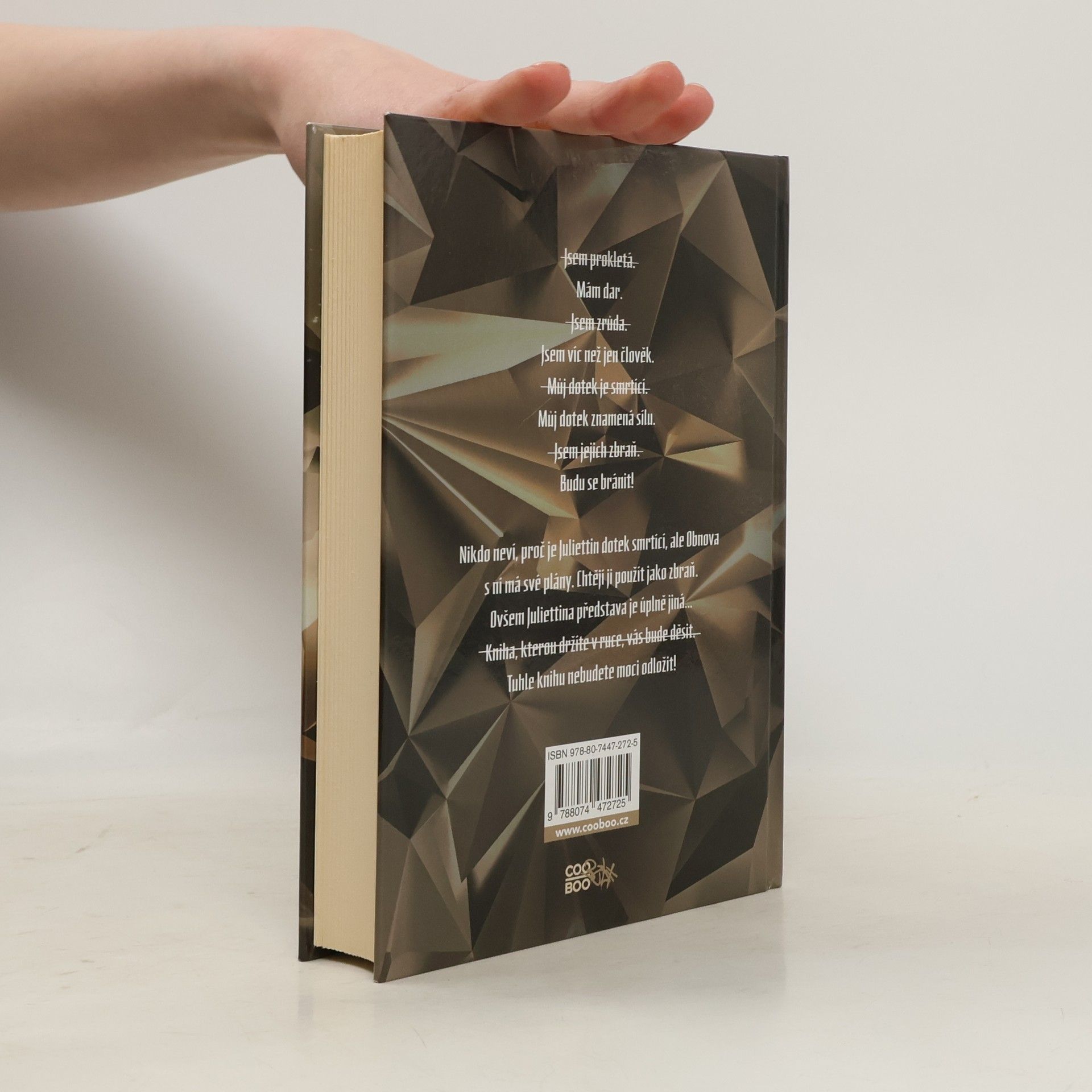 (Jsem prokletá.) Mám dar. (Jsem zrůda.) Jsem víc než jen člověk. (Můj dotek je smrtící.) Můj dotek znamená sílu. (Jsem jejich zbraň.) Budu se bránit. Nikdo neví, proč je Juliettin dotek smrtící, ale Obnova s ní má své plány. Chtějí ji použít jako zbraň. Ovšem Juliettina představa je úplně jiná…