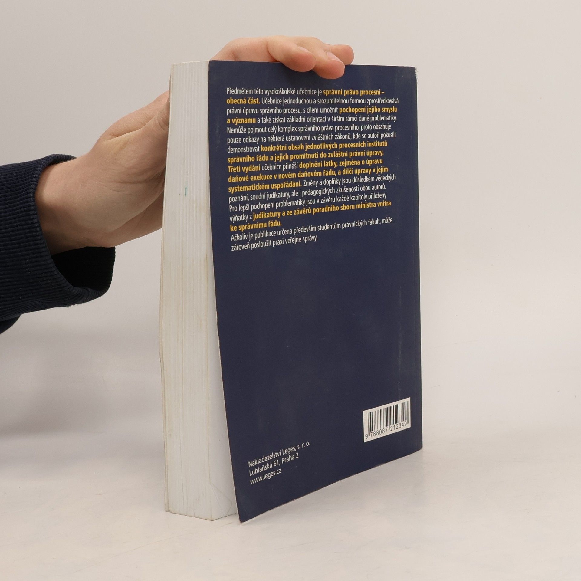 Předmětem této vysokoškolské učebnice je správní právo procesní – obecná část. Učebnice jednoduchou a srozumitelnou formou zprostředkovává právní úpravu správního procesu, s cílem umožnit pochopení jejího smyslu a významu a také získat základní orientaci v širším rámci dané problematiky. Nemůže pojmout celý komplex správního práva procesního, proto obsahuje pouze odkazy na některá ustanovení zvláštních zákonů, kde se autoři pokusili demonstrovat konkrétní obsah jednotlivých procesních institutů správního řádu a jejich promítnutí do zvláštní právní úpravy. Čtvrté vydání učebnice přináší aktualizaci látky a reaguje na novou právní úpravu daňové exekuce. Změny a doplňky jsou důsledkem vědeckých poznání, pedagogických zkušeností obou autorů, a zejména vývoje soudní judikatury: učebnice obsahuje řadu nových soudních judikátů, které mohou přispět ke správné aplikaci jednotlivých procesních institutů. Současně učebnice zohledňuje i nové závěry přijaté poradním sborem ministra vnitra ke správnímu řádu. Výňatky z judikatury a ze závěrů Poradního sboru ministra vnitra ke správnímu řádu jsou také pro lepší pochopení problematiky uvedeny v závěru každé kapitoly. Ačkoliv je publikace určena především studentům právnických fakult, může zároveň posloužit praxi veřejné správy. 4. aktualizované a doplněné vydání.