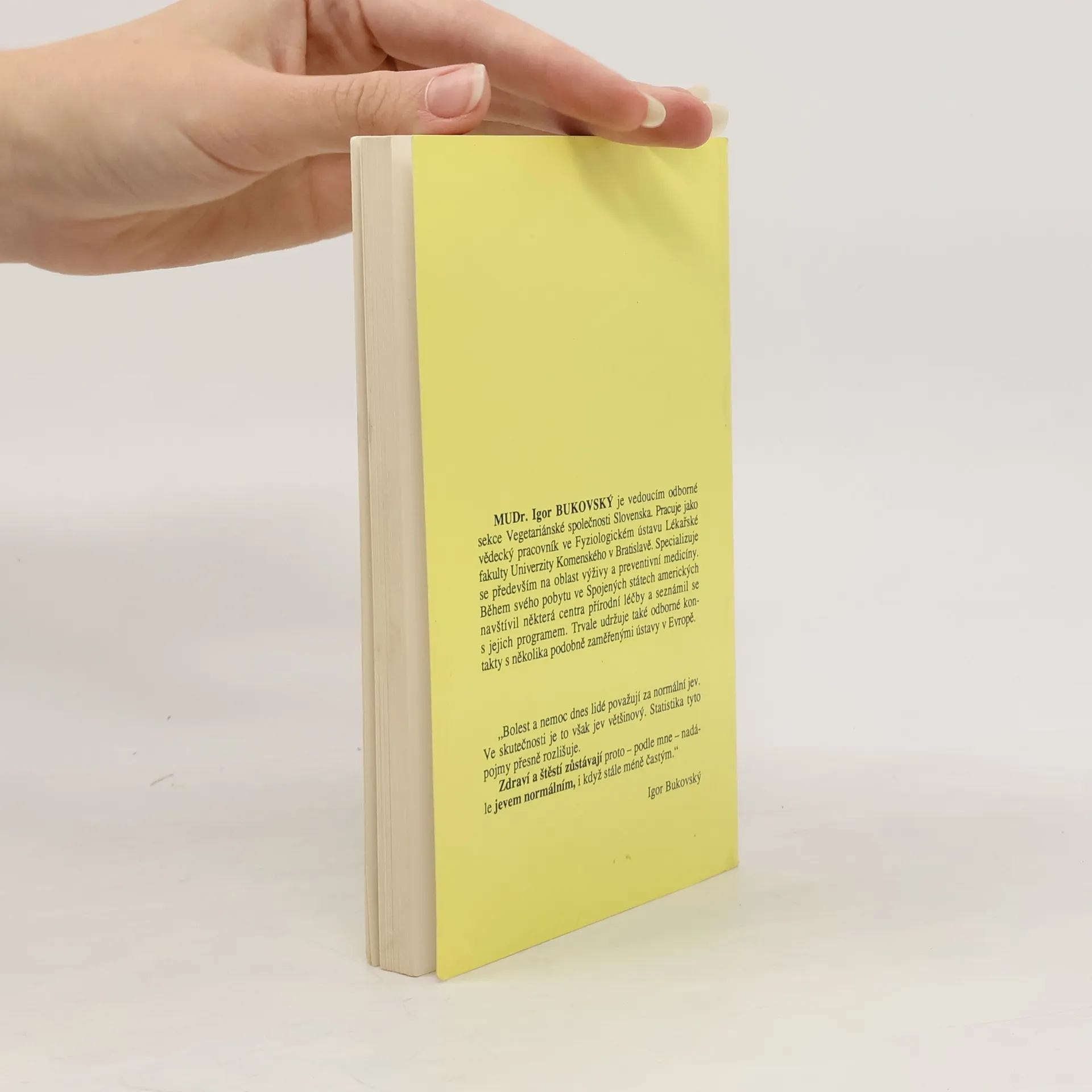 MUDr. Igor Bukovský je odborným asistentem a vědeckým pracovníkem Fyziologického ústavu Lékařské fakulty v Bratislavě. Výživou a preventivním lékařstvím se zabývá od roku 1990. Od r. 1991 se pravidelně účastní všech významných evropských a světových kongresů o výživě a fyziologii člověka. Od r. 1990 veřejně přednáší a publikuje. Je autorem řady rozhlasových a televizních pořadů a novinových článků. Napsal knihy Hledá se zdravý člověk a Vegetariánské dítě. Je členem Britské společnosti pro výživu, Americké společnosti pro klinickou výživu a několika domácích odborných společností. Výzkumná práce dr. Bukovského je zaměřena na vliv oxidací a antioxidantů na raná stadia aterosklerózy. Knížka chce být přehledným a stručným návodem, jak léčit některá častá onemocnění - stravou, úpravou stylu života, bylinkami a zeleninovými šťávami nebo u nás ještě málo známou vodoléčbou.