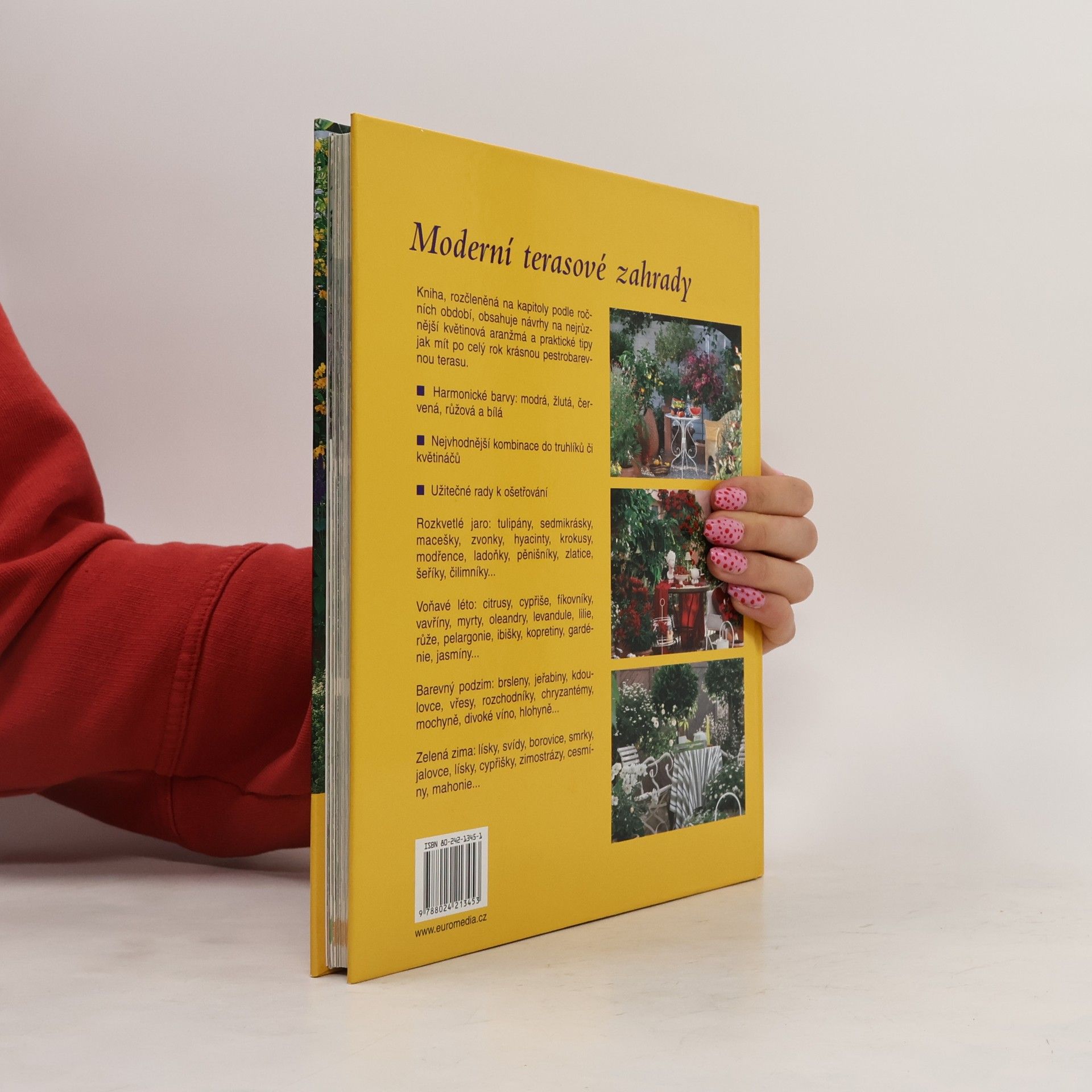 Příručka je rozdělená podle ročních období, obsahuje návrhy na sestavení a pěstování květin na terasách.